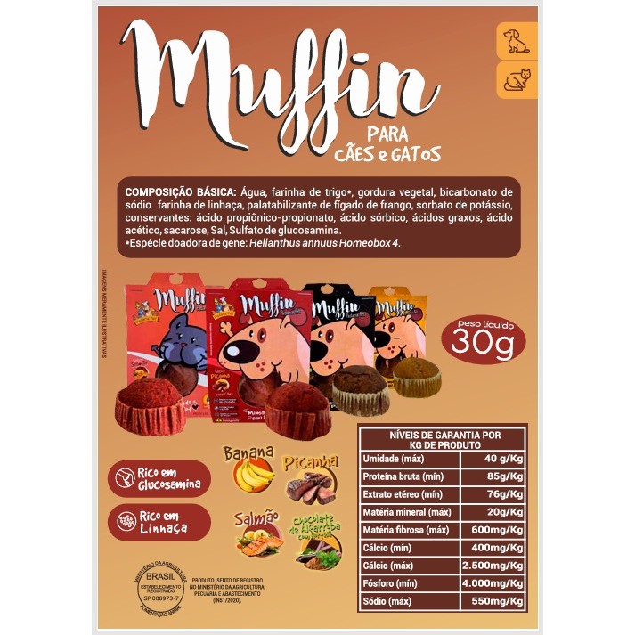 🧁Muffin Padaria Pet PARA GATOS 30 G 😺Alimento específico para Gatos 🎣SABOR SALMÃO DESCRIÇÃO: 🫓Produto pronto para consumo ⚖️Peso Liquido 30 g 🫘Pode ser consumido puro ou misturado na ração. 🐕🦺Específico para gatos a partir de 3 meses de idade. 🫘Fornecer ao animal com Até 15kg - Animais de 15 Kg à 25 Kg: 2 un/dia - Animais acima de 25 Kg à 25 Kg: 3 un/dia 🫘Esse produto não substitui alimento completo. 🐂Uso proibido na alimentação de ruminantes. 👨🏻🌾Proibido o Uso alimentação humana. 🫧Conservar em local seco, arejado e ao abrigo do sol. 🌡️Após aberto, conservar refrigerado, válido por 30 dias. 🗓️Fabricação, Validade e lote vide embalagem. COMPOSIÇÃO: Água, farinha de trigo*, farinha de açafrão, gordura Vegetal, bicarbonato de sódio farinha de linhaça, hidrolisado de figado de suíno, palatabilizante de figado de frango, sorbato de potássio, conservantes: ácido propionico-propionato, ácido sórbico, acidos graxos, ácido acetico, sacarose, Sal, Sulfato de glucosamina, Açafrão (Cúrcuma), aroma de picanha, corante em pó vermelho (INS 171). Espécie doadora de gene: Helianthus annuus Homeobox 4. MODO DE USAR: Alimento específico indicado para gatos para ser oferecido após as refeições ou como demonstração de carinho e obediência. **O produto pode ser armazenado por 12 meses em área seca e fresca. **Após o consumo, feche bem a embalagem de plástico usando um fitilho. **Depois de aberto consumir preferencialmente em até 5 dias.