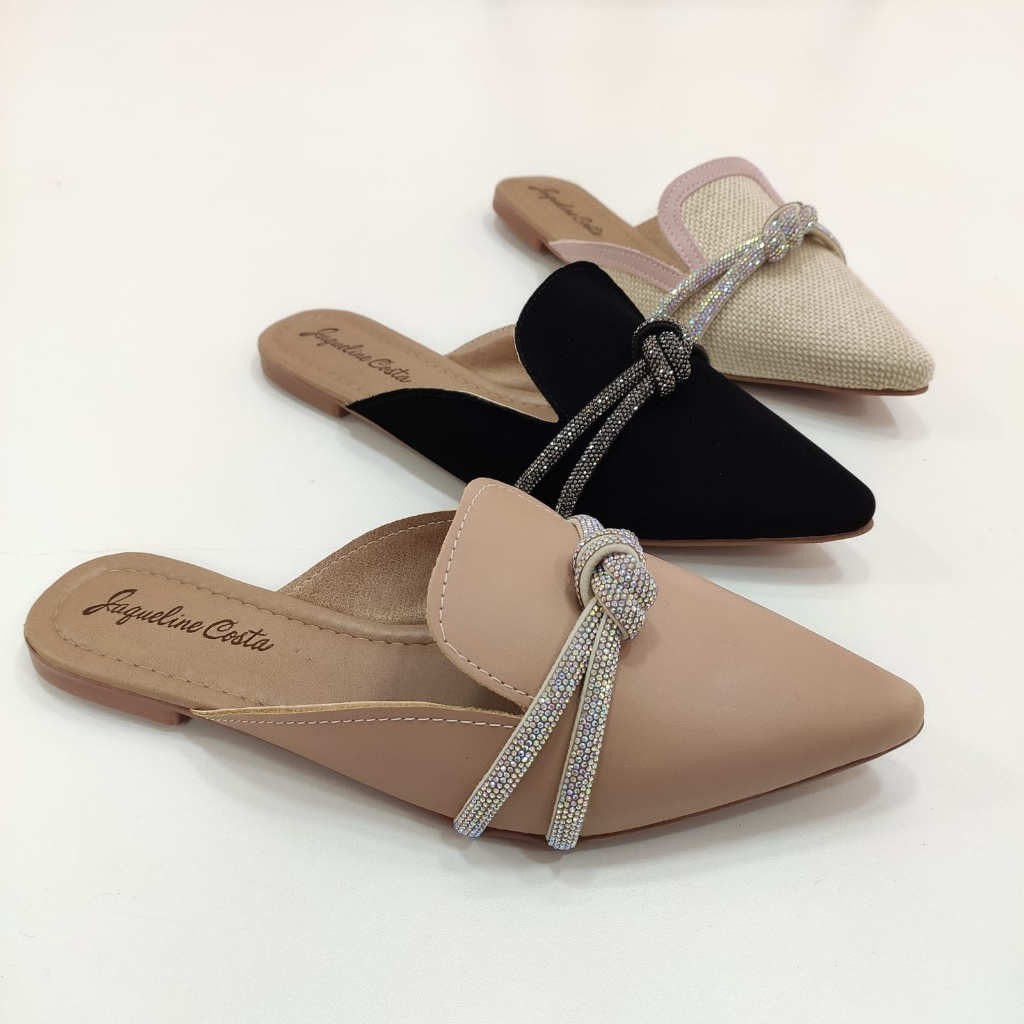 Mule Bico Fino Nó Sapato Feminino Detalhe Strass Brilho Confortável Casual Jaqueline Costa