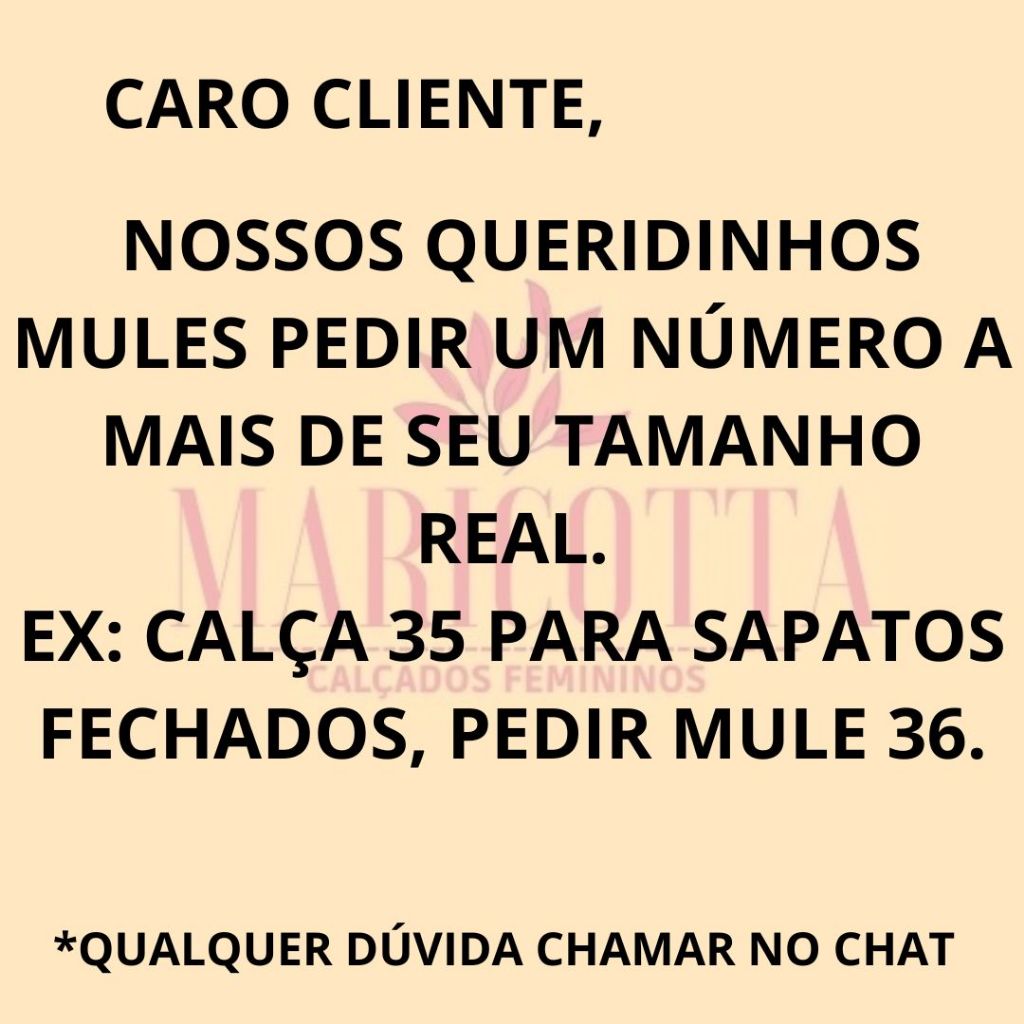 Nossos calçados traz para nossos clientes beleza e conforto, além de modernidade para seu dia a dia . Fluidez do casual, tudo em perfeita harmonia fabricamos com material de ótima qualidade, resistentes assim garantimos o conforto para seus pés mule todo forrado com cacharrel, sola Tratorada baixa palmilha comfort, enfeite ABS Acabamento PREMIUM FABRICAÇÃO PRÓPRIA. ENVIAMOS PARA TODO BRASIL. FOTOS REAIS COMPRIMENTO PALMILHA 33 = 22.5 CM 34 = 23.0 CM 35 = 23.5 CM 36 = 24.0 CM 37 = 24.5 CM 38 = 25.0 CM 39 = 25.5 CM 40 = 26.0 CM <<<<<<<ATENÇÃO>>>>>>> ** COMPRE UM NUMERO MAIOR DO QUE VOCÊ COSTUMA USAR *