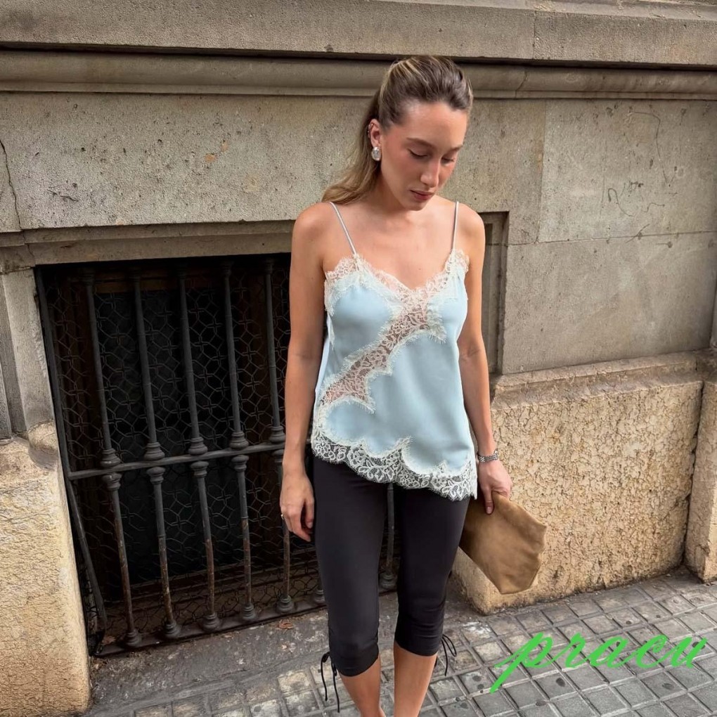 Mulheres Verão Renda Guarnição Cetim Camisolas Com Decote Em V Cinta Espaguete Sem Costas Assimétrico Topos