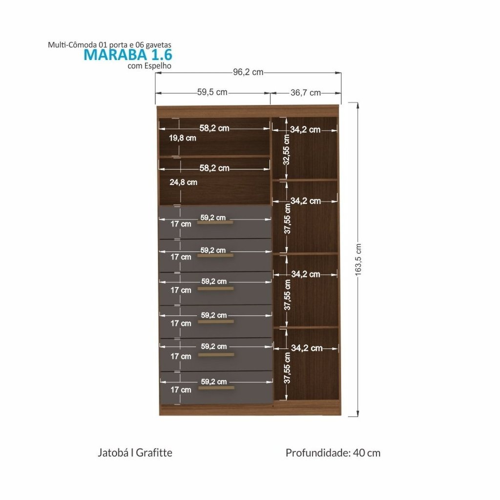 Multi-cômoda 1 Porta 6 Gavetas Marabá com Espelho Jatoba/Grafite