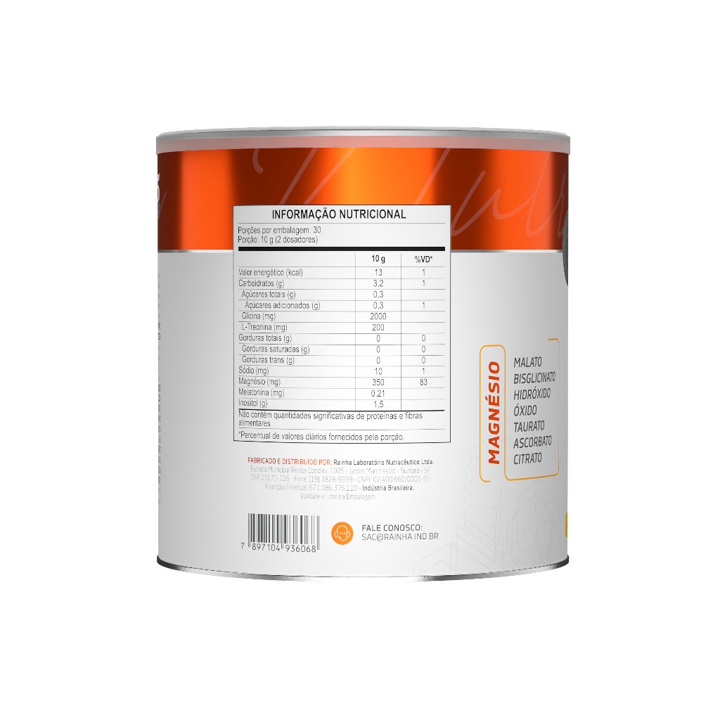 MULTI MAG INOSITOL Ingredientes (Sabor Manga): Glicina, Maltodextrina, Inositol (Mio-inositol), Magnésio (Malato de magnésio, Bisglicinato de magnésio, Hidróxido de magnésio, Óxido de magnésio, Taurato de magnésio, Ascorbato de magnésio e Citrato de magnésio), L-Treonina, Melatonina, Acidulante Ácido cítrico, Antiumectante Dióxido de silício, Aromatizante sintético idêntico ao Natural, Edulcorante Glicosídeos de esteviol (Stevia rebaudiana) e Corante Natural Urucum. NÃO CONTÉM GLÚTEN. NÃO CONTÉM LACTOSE. ALÉRGICOS: PODE CONTER LEITE E SOJA*. *Produzido em equipamento onde se processam também estes alimentos, contudo, ações preventivas de limpeza são adotadas para evitar essa ocorrência. Modo de Preparo: Diluir 10 g (aproximadamente 2 dosadores) em 150 ml (1 copo americano) de água ou bebida de sua preferência, mexendo até completa dissolução. Sugestão de Uso: Consumir 1 (uma) porção 1 (uma) vez ao dia. PRODUTO INDICADO PARA MAIORES DE 19 ANOS. Conservação: Manter em local fresco, não úmido e ao abrigo da luz. Não consumir o produto se o lacre de proteção estiver violado. Após aberto, consumir preferencialmente em 60 dias. Advertências: ?ESTE PRODUTO NÃO É UM MEDICAMENTO?. ?NÃO EXCEDER A RECOMENDAÇÃO DIÁRIA DE CONSUMO INDICADA NA EMBALAGEM?. ?MANTENHA FORA DO ALCANCE DE CRIANÇAS?. ?ESTE PRODUTO NÃO DEVE SER CONSUMIDO POR GESTANTES, LACTANTES E CRIANÇAS?. ?ESTE PRODUTO NÃO DEVE SER CONSUMIDO POR PESSOAS ENVOLVIDAS EM ATIVIDADES QUE REQUEREM ATENÇÃO CONSTANTE?. ?PESSOAS COM ENFERMIDADES E/OU SOB O USO DE MEDICAMENTOS, CONSULTE SEU MÉDICO." Apresentação: Lata com 300g
