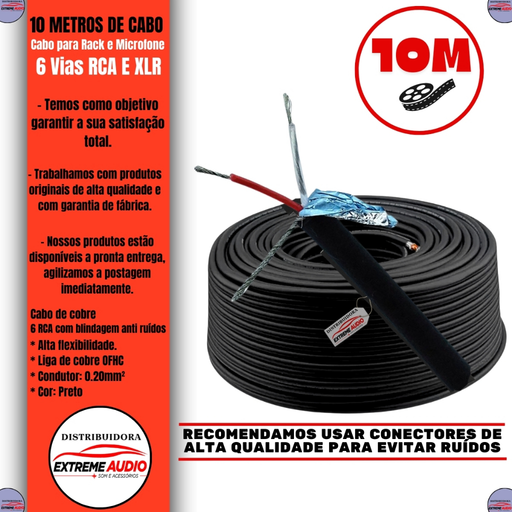 Multicabo para ligacoes/interligacoes estereo fabricado em liga de Cobre OFHC (Isento de Oxigenio) bitola de 0,20mm2/24 AWG, estanhado, com veias numeradas. CONSTRUCAO: - Condutor: Condutor em cobre estanhado OFHC 24 AWG. - Isolamento: Isolado em Polietileno termoplastico resistente a alta temperatura e baixa retracao durante a solda. - Blindagem: Fita de aluminio + fio de cobre (dreno) 0,20mm2 - Cobertura: Cobertura em PVC emborrachado e flexivel. - Veias numeradas na cor azul, e capa preta. - 01 fio positivo, 01 fio negativo, 01 fio malha/ CARACTERISTICAS: - Gravacao alfanumerica das vias a cada 5cm - Vem com sistema rip-cord que facilita a abertura da capa. - Alta flexibilidade. - Liga de cobre OFHC - Condutor: 0.20mm2 - Isolamento: Polietileno - Cor: Preto Disponiveis nas configuracoes: 6Vias (espaguetes) Vias numeradas para identificacao Cobertura de PVC emborrachado, mais flexivel e resistente Veias revestidas de PE de baixa densidade Bitola: 24 AWG (0,20mm) Compatibilidades: - Meduza de Microfone e acessorios - Cabos de Audio CONTEUDO DA EMBALAGEM: - 10 Metros de Multicabo 06 vias Importante: - Cabo vendido por metragem - Valor referente a 10 metros - Imagens meramente ilustrativas - Garantia de fabrica com duracao de 12 meses - Recomendamos que a instalacao seja feita por um profissional, e nao nos responsabilizamos pelo mau uso do produto.