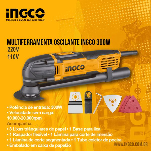 MULTIFERRAMENTA OSCILANTE 110V OU 220V INGCO 300W C/ ACESSÓRIOS Características: • Potência de entrada: 300W • Velocidade sem carga: 10.000-20.000rpm Acompanha: • 3 Lixas triângulares de papel • 1 Base para lixa • 1 Raspador flexível • 1 Lâmina para corte de imersão • 1 Lâmina de corte segmentada • 1 Tubo coletor de poeira Tensão: 110V OU 220V ITENS INCLUSOS: 01 - MULTIFERRAMENTA OSCILANTE 110V OU 220V INGCO 300W C/ ACESSÓRIOS Nuvem de Tags: Multiferramenta Oscilante, INGCO, Ferramenta elétrica, Multifuncional, Cortar, Lixar, Oscilação, Cortes, Lixamento, Raspagem, Reparos, Bricolagem.