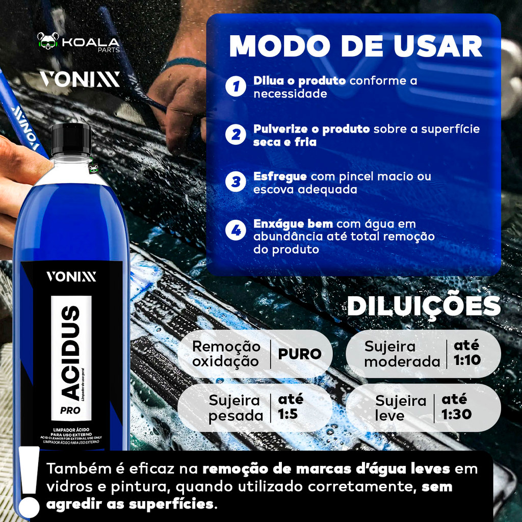 Acidus PRO 1,5L - Vonixx LIMPEZA PESADA DE ALTA PERFORMANCE! O Acidus PRO da Vonixx é um multilimpador ácido ultra concentrado, desenvolvido para remover contaminantes que limpadores convencionais não conseguem eliminar. Indicado para limpeza externa de: • Rodas • Chassis • Emblemas e frisos • Plásticos externos • Metais e partes cromadas • Compartimento do motor • Grades, cantos e áreas de difícil acesso Também é eficaz na remoção de marcas d’água leves em vidros e pintura, quando utilizado corretamente, sem agredir as superfícies. DILUIÇÕES RECOMENDADAS: Remoção de oxidação: Puro Sujeira pesada: 1:5 Sujeira média: 1:10 Sujeira leve: 1:30 Como usar: 1. Dilua o produto conforme a necessidade. 2. Aplique com pulverizador sobre a superfície fria e seca. 3. Esfregue com pincel macio ou escova adequada. 4. Enxágue com água em abundância até remover totalmente o produto. Enviamos bem embalado, super rápido e com garantia de originalidade. Garanta o seu e confira os outros produtos da nossa Loja Koala Parts. Especificações Técnicas: Volume: 1,5L Estado físico: Líquido viscoso Cor: Azul Odor: Característico pH: 2,1 a 3 O que você recebe: 01. Acidus PRO 1,5L - Vonixx