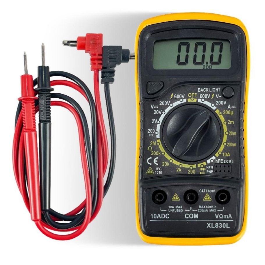 O multímetro MD-200L é um instrumento digital portátil com fusível de auto restauração, teste de linha viva, proteção emborrachada, LCD de 3 ½ dígitos com iluminação de fundo, de acordo com a categoria II de segurança, congelamento de leitura, desligamento automático e mudança de faixa manual. Realiza medidas de tensão DC e AC, corrente DC e AC, resistência, hFE de transistor, diodo e continuidade.