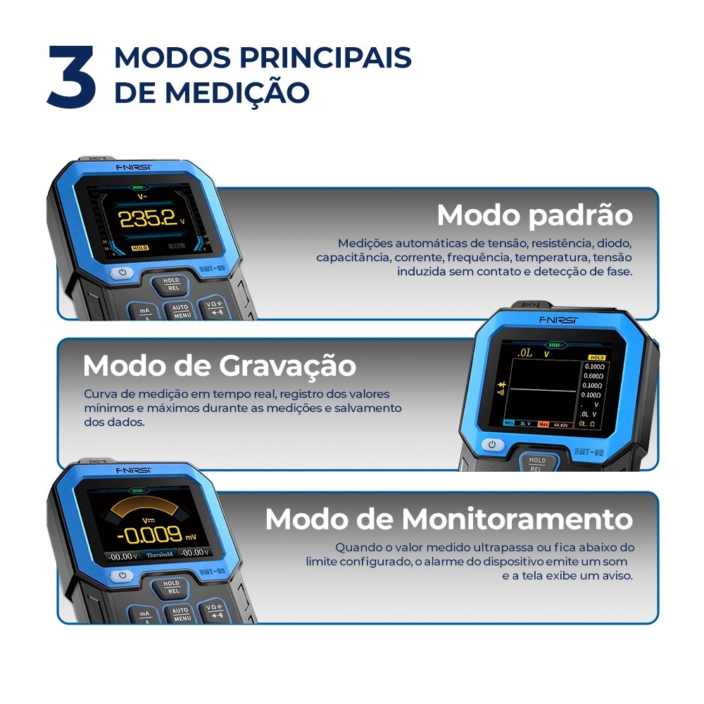 Multímetro Digital FNIRSI DMT-99 Profissional Display 2,4 O Multímetro Digital FNIRSI DMT-99 Profissional Display 2,4 combina precisão com funcionalidade para medições em sistemas de até 999V. Cat. I 750V, e com Isolamento Dupla, o DMT-99 oferece segurança e desempenho avançado. Recursos e Benefícios: Display Amplo: Amplo display de 2,4 polegadas para melhor visualização. Design Compacto e Funcional: Formato ergonômico, proporcionando conforto no uso prolongado. Funcionalidades Adicionais: Equipado com teste de continuidade, teste de diodo e medição de resistência, corrente e tensão. Segurança: Cumpre com a IEC 61010-1, ideal para medições em sistemas de baixa e média tensão. O Multímetro FNIRSI DMT-99 oferece medições precisas e confiáveis para técnicos e profissionais, com a segurança de uma construção robusta e certificada. Ficha Técnica: Contagem Máxima do Display: 2000 contagens (3 ½ Dígitos); Taxa de Amostragem: 9.999MHz; Indicação de Polaridade: Automática; Impedância: Aproximadamente 999.9Ω; Faixa de Tensão: 750V; Faixa de Corrente: 9.999A; Dimensões: 155mm (A) x 80mm (L) x 36mm (P); Peso: 185g; Garantia: 6 meses. Acessórios Inclusos: Manual de Instruções, ponta de prova (1 par), bateria 9V