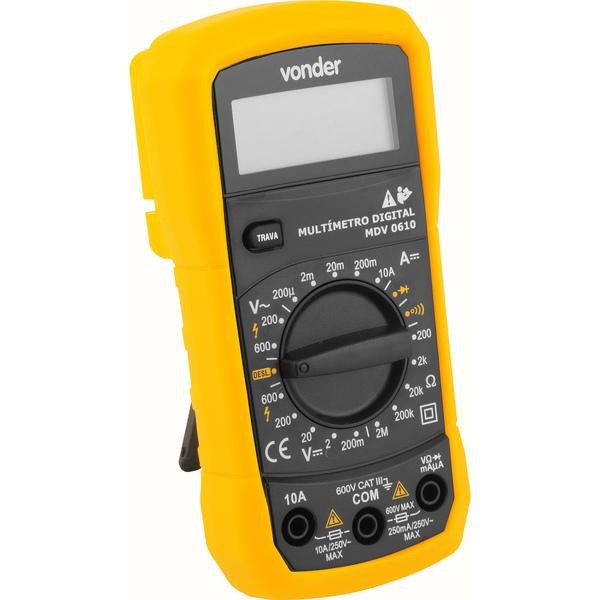 Conteúdo da Embalagem: 1 Multímetro digital, acompanha: 1 par de pontas de prova e 1 bateria 9 V Descrição: Multímetro digital MDV 0610 VONDER Aplicações e dicas de uso: Indicado para realizar medidas de tensão AC e DC, corrente DC, resistência e teste de diodo. Utilizado na medição em aparelhos e sistemas elétricos e eletrônicos, sendo muito utilizado devido à sua simplicidade de uso e portabilidade. Destaques e diferenciais: Compacto, é indicado para trabalhos em baixa tensão. Possui funções de voltímetro, amperímetro (corrente contínua até 10 A), ohmímetro e teste de continuidade. Atende às exigências da Norma IEC61010-1. Características Técnicas: Categoria do multímetro: CAT ll 600V Números de dígitos /Contagem do multímetro: 3 1/2 dígitos - 0 a 1999 Capacidade de tensão AC do multímetro: 600 V Capacidade de tensão DC do multímetro: 600 V Resolução de tensão AC do multímetro: 100 mV / 1 V Resolução de tensão DC do multímetro: 100 µV / 1 mV / 10 mV / 100 mV / 1 V Precisão de tensão AC do multímetro: ± (1,2% +10) Precisão de tensão DC do multímetro: 200 mV / 2 V / 20 V / 200 V: ± 0.5% ± 2 - 600 V: ± 0.8% ± 2 Faixa de tensão AC do multímetro: 200 V / 600 V Faixas de tensão DC do multímetro: 200 mV / 2 V / 20 V / 200 V / 600 V Capacidade de corrente AC do multímetro: N/A Capacidade de corrente DC do multímetro: 10 A Precisão de corrente AC do multímetro: N/A Precisão de corrente DC do multímetro: 200 µA / 2 mA / 20 mA: ± 1% ± 2 - 200 mA: ± 1.5% ± 2 - 10 A: ± 3% ± 2 Resolução de corrente AC do multímetro: N/A Resolução de corrente DC do multímetro: 0.1 µA / 1 µA / 10 µA / 100 µA / 10 mA Faixas de corrente AC do multímetro: N/A Faixas de corrente DC do multímetro: 200 µA / 2 mA / 20 mA / 200 mA / 10 A Capacidade de resistência do multímetro: 2 M? Resolução resistência do multímetro: 0.1 ? / 1 ? / 10 ? / 100 ? / 1 k? Precisão resistência do multímetro: 200 ?: ± 0.8% ± 3 - 2 k? / 20 k? / 200 k?: ± 0.8% ± 2 - 2 M?: ± 1.0% ± 2 Faixas de resistência do multímetro: 200 ? / 2 K? / 20 K? / 200 k? / 2 M? Faixas de medição de temperatura do multímetro: N/A Resolução de temperatura do multímetro: N/A Precisão de temperatura do multímetro: N/A Capacidade de medição de capacitância do multímetro: N/A Faixas de medição de capacitância do multímetro: N/A Resolução da capacitância do multímetro: N/A Precisão da capacitância do multímetro: N/A Teste de diodo do multímetro : Possui Teste de continuidade do multímetro: Possui Sinal sonoro de continuidade do multímetro: Possui - <100 ? Função tecla HOLD do multímetro: Possui Capacidade de medição de frequência do multímetro: N/A Resolução de frequência do multímetro: N/A Faixas de frequência do multimetro: N/A Faixa de Temperatura de operação do multímetro: 0°C a 40°C Capacidade de medição de luminosidade (lux) do multímetro: N/A Resolução de luminosidade (lux) do multímetro: N/A Precisão de luminosidade (lux) do multímetro: N/A Faixas de medição de luminosidade (lux) do multímetro: N/A Indicador de bateria fraca do multímetro: Possui Alimentação: Bateria de 9 V (NEDA 1604 ou 6F22) Comprimento do multímetro: 140 mm Largura do multímetro: 67 mm Espessura do multímetro: 30 mm Garantia legal: 90 dias + Garantia contratual: 3 meses