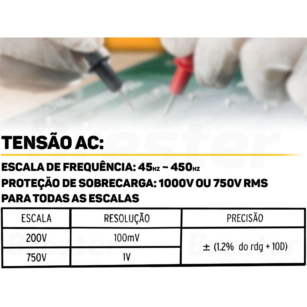 Olá, Bem vindo a Distribuidora Brester. Trabalhamos com uma grande variedade de ferramentas elétricas e manuais, descartáveis, eletroeletrônicos, artigos para casa, artigos de petshop e outros. Aqui você encontrará Produtos Originais, Nota Fiscal, Pronta Entrega e Envio Imediato! * Características do produto * Multímetro Digital Profissional Portátil Western 978MD Ideal para o uso doméstico e para manutenção de equipamentos elétricos e também para o aprendizado de estudantes de elétrica, fazendo a medição de seus experimentos Possui proteção de sobrecarga completa e indicador de bateria fraca Especificações Técnicas: > Display: 3 ½ Dígitos (2000 Contagens) > Indicação De Sobre-faixa: Mostra Apenas O Dígito Mais Significativo (1) > Temperatura De Operação: 0°C A 50°C, RH < 70% > Temperatura De Armazenamento: -20°C A 60°C, RH < 80% > Uso Interno > Alimentação: 1 x 9V (Inclusa) > Dimensões: 12,5(A) x 7(L) x 2,5(P)cm > Peso: Aproximadamente 150g Tensão DC: > Faixas: 200mV, 2000mV, 20V, 200V, 1000V > Resolução: 100µV, 1mV, 10mV, 100mV, 1V > Precisão garantida: 200mV ± (0.5% do rdg + 3D); 2000mV ~ 200V ± (0.8% do rdg + 2D); 1000V ± (1.0% do rdg + 2D) > Impedância de Entrada: 1MW > Proteção de Sobrecarga: 220V AC RMS para faixa 200mV; 1000V DC / 750V AC RMS para outras faixas Tensão AC: > Faixas: 200V, 750V > Resolução: 100mV, 1V > Precisão: 200V ~ 750V ± (1.2% do rdg + 10D) > Impedância de Entrada: 1MW > Resposta em Frequência: 45Hz a 450Hz > Proteção de Sobrecarga: 1000V DC / 750V AC RMS Corrente DC: > Faixas: 200µA, 2000µA, 20mA, 200mA, 10A > Resolução: 0,1µA, 1µA, 10µA, 100µA, 10mA > Precisão: 200µA ~ 20mA ± (1,8% do rdg + 2D); 200mA ± (2,0% do rdg + 2D); 10A ± (2.0% do rdg + 10D) > Proteção de Sobrecarga: 500mA/250V Fusível (Escala De 10A Sem Fusível) > Medida De Baixa Corrente: 200mV Resistência: > Faixas: 200Ω, 2000Ω, 20kΩ, 200kΩ, 2000kΩ > Resolução: 100mΩ, 1Ω, 10Ω, 100Ω, 1kΩ > Precisão: 200Ω ± (1,0% do rdg + 10D); 2000Ω ~ 2000kΩ ± (1,0% do rdg + 4D) > Tensão Máxima De Circuito Aberto: 3,2V > Proteção De Sobrecarga: 220V RMS (Máximo 15s) Acompanha: > 01 Multímetro Digital > 01 Manual De Instruções > 01 Par De Pontas (01 Vermelha E 01 Preta -Espessura 2,7mm) > 01 Bateria 9V (NEDA1604, 6F22) Instalada No Instrumento > Display: 3½ dígitos, 7 segmentos, LCD 0,5" - Marca: Western - Garantia: 90 dias contra defeitos de fabricação Vantagens de comprar na Brester: - Nota fiscal para Pessoa Física e Pessoa Jurídica. - Produto novo, com garantia de fábrica. - Produto a pronta entrega. - Envio em até 24hs em dias úteis após confirmação do pagamento. Obrigado por escolher a Brester Máquinas.