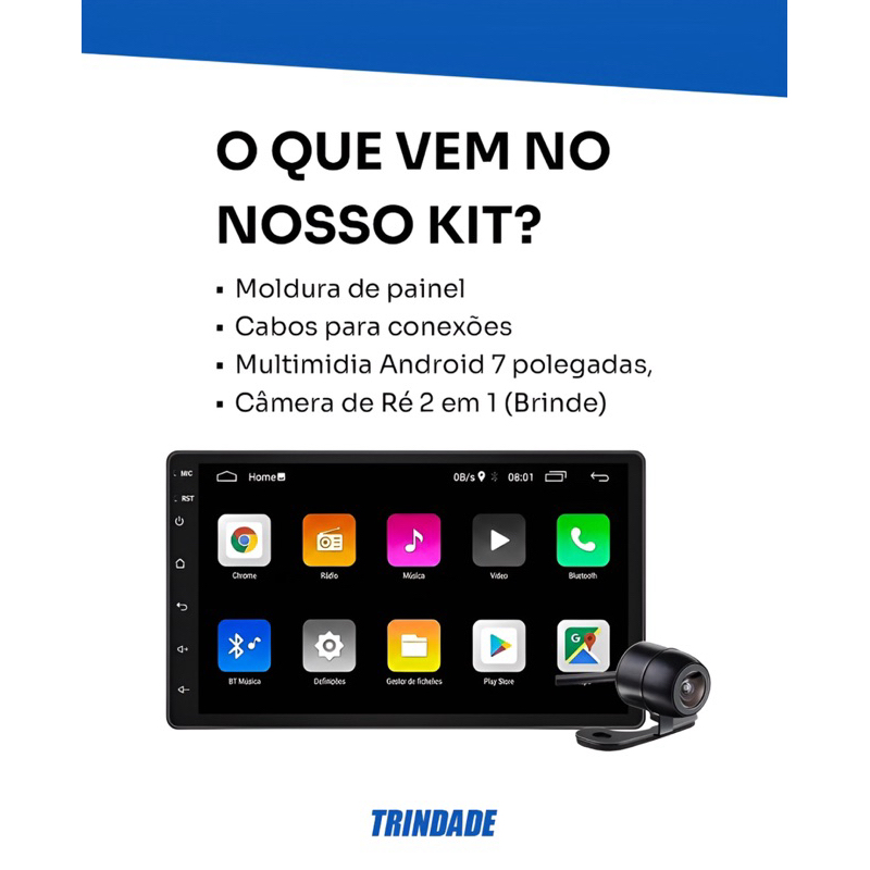 Imagine a bordo do seu carro, com tudo ao seu alcance. Com um multimídia Android automotivo, seu veículo se transforma em um centro de comando moderno, oferecendo muito mais que um simples rádio. É a combinação perfeita de tecnologia de ponta e praticidade, pensada para quem busca o melhor em conectividade e entretenimento. Conteúdo da embalagem : - 1 Central Multimídia Android - 1 Câmera de ré - 1 Moldura de Painel - Acessórios de instalação Pronto para transformar sua viagem? ESPECIFICAÇÕES TÉCNICAS: - Sistema Operacional: Android 13 - Memória: RAM 2GB / ROM 32GB - Função Wifi - Função RDS: sistema de transmissão de dados digital - Resolução HD: 1280x720 - Display: IPS-LCD FULL TOUCH (CAPACITIVA) HD - Proteção de Tela Gorilla Glass - Bluetooth: Música e Ligação (microfone interno) - Espelhamento sem fio - Configuração: Especial pra molduras 7 polegadas - Conector: ISO, com fusível de proteção - Potência: 4x25W RMS – 50W PMPO - Sintonizador: FM1, FM2, FM3 com até 54 posições de salvamento de estação - Volume: 0~40 - Ratio: 60dB - Equalizador: Usuário, Padrão, Rock, POP, Ao vivo, Eletrônica, Clássica, Suave, Jazz - Áudio: Equalizador gráfico digital, LOUND, Aumento de GRAVE - Fader Digital: Localização precisa do foco de som - IR Controle Remoto: não tem - Compatibilidade de áudio: MP3/MP2/ WAV/WMA/AAC/AMR/FLAC/M4A/OGG/RA /APE - Compatibilidade de vídeo: 3G2/ASF/AVI/DivX/mkv/MOV/Mp4/MPG/TS/WMV/VOB/MTS/WEBM/M4VRMVB/FLV/H.264 - Apps: Google Play. - GPS integrado - Microfone: externo