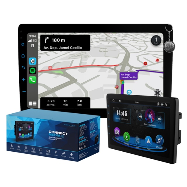 W16 AUDIO, TRANSFORMANDO MÚSICA EM EMOÇÕES Central Multimidia Faaftech Connect Media FT-MM-CM9 9 polegadas Com Carplay e Android Auto Apresentamos a linha ConnectMedia, centrais multimídia de alta performance, oferecendo conectividade com Apple CarPlay e Android Auto, tela de vidro 2.5D de alta resolução, interface gráfica moderna e entradas para câmeras traseira e frontal para manobras ainda mais seguras. Além de um excelente custo-benefício. - Entrada AV: Adicione Tv ou outro acessório - Touch Screen Capacitivo: Projetada para uma resposta imediata e interação intuitiva. - Conectividade para Carplay e Android Auto - Espelhamento: Espelhe os aplicativos do seu smartphone na tela da central, garantindo acesso fácil e rápido às suas funcionalidades preferidas. - Tela de vidro 2.5D: Desfrute da elegância e sensibilidade aprimorada de uma tela de vidro 2.5D, unindo estilo e funcionalidade de forma harmoniosa. - Entrada para Câmera de Ré e Frontal - Configure suas preferências do jeito que quiser - Ouça musicas do seu streaming favorito - Chamadas Hands Free para mais segurança - Saídas de áudio especializadas, inclusive para subwoofer. - 2 Entradas USB * Produto regularizado pela ANATEL: 14451-23-16000 ESPECIFICAÇÕES: - Rádio: FM 87.50MHz-107.9MHz - Bluetooth: 5.4 HFP+A2DP - Tela: LCD de 9 Polegadas - Resolução de Tela: 1024×600 - Toque de Tela: Capacitivo - Proporção de Tela: 16:9 - Sistema de Vídeo: NTSC - Saída de Áudio: 4 x 50W - Impedância: 4 Ohms - Tensão de Operação: 10.5-16V - Consumo em Stand-By: 2mA - Temperatura de Operação: -20 ~ 70°C - Temperatura de Armazenamento: -40 ~ 85°C - Iluminação dos botões: RGB CONEXÕES: - 2 Entradas USB traseiras - Entrada para câmera traseira - Entrada AV/câmera frontal - Saídas de vídeo para telas traseiras - Saída de áudio RCA para amplificador - Saída para Subwoofer - Entrada de comandos de volante para carros com sistema resistivo - Entrada para antena de Rádio MÍDIAS COMPATIVEIS: - Vídeo: MP4, AVI, DIVIX, VOB, FLV, MKV, MPG, RM, RMVB, VOB, DAT, MP2, 3GP - Áudio: MP3, WMA, AAC, FLAC e WAV - Imagem: BMP, JPEG, GIF e PNG BLUETOOTH: - Bluetooth Audio Streaming (Músicas) - Bluetooth Hands-Free (Chamadas Telefônicas) CONTEUDO DA EMBALAGEM: - Central multimídia ConnectMedia Universal de 9" - Chicote padrão ISO - 2 Chicote extensão USB - Chicote de entrada de câmera - Chicote de Conectividade RCA diversos - Suporte de fixação INSTALAÇÃO: - Moldura: Precisara de uma moldura compativel com seu carro - Chicote: A Central Multimídia é acompanhada de chicotes configurados para o padrão ISO, amplamente adotado em diversos modelos de veículos. No caso de seu carro não seguir esse padrão, chicotes adaptadores estarão à sua disposição no mercado, assegurando uma instalação compatível e eficiente.