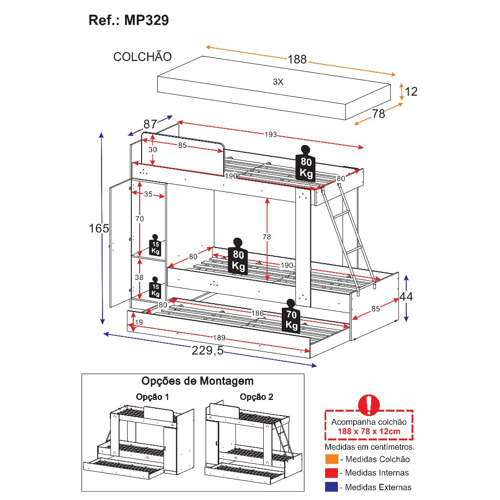 Produzido em MDP com pintura UV acetinada, o Treliche com Colchão Incluso e Barra de Proteção Multimóveis garante durabilidade e resistência. Suportando até 80kg nas camas principais e 70kg na cama auxiliar, possui barra de proteção na cama superior para evitar quedas, além de uma porta lateral com prateleira interna, que oferece amplo espaço para organizar pertences. A escada metálica em ângulo facilita o acesso à cama superior, tornando sua utilização prática e segura. Versátil, pode ser montado dos dois lados - esquerdo ou direito. Para acrescentar conforto, acompanha colchão D23 com tratamento antiácaro e antialérgico, proporcionando noites de sono mais tranquilas e saudáveis. Conteúdo da Embalagem: 1 (um) Treliche 3 (três) Colchões Manual de Montagem Kit Ferragem Dimensões do produto montado: Treliche - Altura: 165cm | Largura: 229,5cm | Profundidade: 87cm Colchão: Altura: 12cm | Largura: 188cm | Profundidade: 78cm *Você pode consultar as medidas detalhadas na imagem técnica do produto. *Obrigatório fixar o treliche na parede. *As cores do produto podem sofrer variações de tonalidade de acordo com as configurações do seu dispositivo. Imagem meramente ilustrativa. Decoração não acompanha o produto. O produto será entregue desmontado e não disponibilizamos o serviço de montagem.