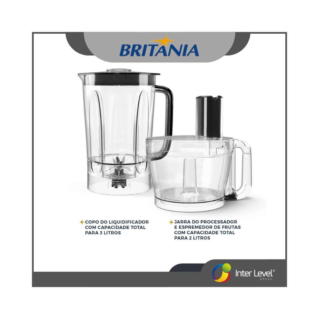 Multiprocessador 5 Em 1 1300w Bmp2000 Britânia ATENÇÃO: ESCOLHA A VOLTAGEM NA VARIAÇÃO --- Descrição --- - Design moderno é um dos diferenciais do Multiprocessador BMP2000 Britânia! - Com 1300W ele garante maior potência que permite mais liberdade na hora de escolher os alimentos que serão triturados ou processados. - Um Multiprocessador é 5 em 1, multiprocessador, liquidificador, 1 lâmina raladora, 1 lâmina fatiadora e 1 espremedor, ou seja, muita criatividade para as suas receitas! Processe, liquidifique, rale e fatie os mais variados alimentos. - O BMP2000 possui 2 velocidades + função pulsar, facilitando o preparo das suas receitas. - Além disso, esse Multiprocessador Britânia acompanha Jarra com capacidade para 2,1l e Liquidificar com copo com 2 litros de capacidade útil. - Multifuncional, compacto e eficiente. O Multiprocessador Britânia BMP2000 5 em 1 é tudo que sua cozinha precisa! --- Especificações Técnicas --- • Trava de segurança: o aparelho só funciona com a jarra/copo encaixados na posição correta • Capacidade da Jarra do processador 2,1L • Capacidade do copo do liquidificador total de 3L e útil de 2L • 1300W de potência • 02 velocidades + pulsar • Design vertical: ocupa menos espaço na cozinha • Todos os acessórios podem ser levados a lava-louças • Pés antiderrapantes • Funções: processar, ralar, cortar, fatiar, espremer, picar, liquidificar. • Modelo: BMP2000; • Possui trava de segurança: Sim; • Funcionamento: O aparelho só funciona com a jarra/copo encaixados na posição correta; • Cor: Preto; --- Dimensões --- - Do Produto - • Altura: 36,2 cm; • Largura: 45,4 cm; • Comprimento: 23,8 cm; • Peso: 3,497 kg. - Da Embalagem - • Altura: 36,2 cm; • Largura: 45,4 cm; • Comprimento: 23,8 cm; • Peso: 4,088 kg. --- Composição da Embalagem --- • 1 Copo de liquidificador; • 1 Jarra de multiprocessador; • 1 Espremedor de frutas; • 1 Adaptador de lâminas; • 1 Lâmina de fatiar; • 1 Lâmina de ralar; • 1 Lâminas de processar. — Perguntas Frequentes — O produto é original? Sim, pirataria é crime e deve ser denunciado à Shopee. Acompanha Nota Fiscal? Sim. O produto tem a garantia legal do fabricante? Sim. Consulte o campo garantia do anúncio. Estoque limitado – Garanta já o seu! Compre agora e aproveite nossas promoções especiais!