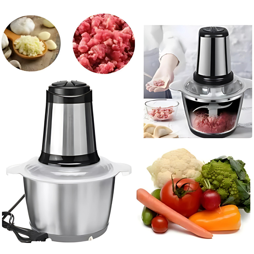 Principais Caracteristicas Compacto em aço inoxidável, aparência agradável, fácil de lavar e operar.*Tem metal ao sistema de acoplamento de condução durável do metal. Possui lâmina de aço inoxidável e tapetes de borracha antiderrapantes Possui 2 velocidades, com isso pode moer e picar varios tipos de carne, legumes, frutas, grãos e temperos Especificação: Material: Aço inoxidável Capacidade: 2 Litros Potência nominal: 450w Potência máxima de pico: 450w Tensão avaliado: 220v Frequência avaliado: 50hz Velocidade: cerca de 6000 - 22000 rpm Lâmina: Aço Inoxidável quatro lâmina Velocidade: 2 Velocidades Corpo do copo: Aço inoxidável ATENÇÃO: É normal ter um odor na primeira vez que você o usa. Desaparece depois de dois ou três moinhos.2. se a retalhadora não funcionar, ou treme muito, ou é muito barulhento durante o trabalho, isso significa que há muita alimentação, ou a tigela da retalhadora, as lâminas ou o motor não se encaixam corretamente. Certifique-se de que a máquina está instalada corretamente e não encha a retalhadora de papel com mais de 1 kg de carne.3. Se as facas ficarem presas, prenda a comida na tigela e remova. Corte os alimentos em pedaços menores, coloque-os na tigela de trituração e repita o processo.4. A Máquina pode trabalhar somente quando a base do motor instalada corretamente e firmemente na cobertura da bacia!