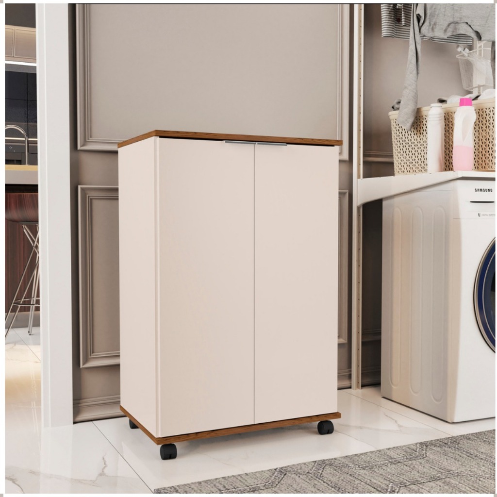 Armário Multiuso Pratic com Rodízios e 2 Portas Aplicações sugeridas: Área de serviço: Armazene sabão em pó, amaciante e produtos de limpeza em geral. Escritório: Organize pastas, arquivos e folhas de papel. Cozinha: Guarde copos, vasilhas e utensílios diversos. Características do Produto: 2 portas com puxadores 2 prateleiras (removíveis) 4 rodízios para facilitar a movimentação Material: MDP de 12mm Dimensões: Altura: 115 cm Largura: 61 cm Profundidade: 36 cm Conteúdo da Embalagem: 1 Armário multiuso 1 Kit de montagem completo Manual de instruções Informações adicionais: Produto enviado desmontado Imagens meramente ilustrativas Objetos decorativos não acompanham o produto