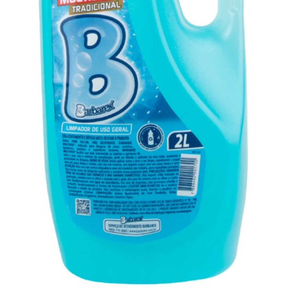 Multiuso Barbarex Tradicional 2L O Multiuso Barbarex é indicado para limpeza de pisos, cozinhas, banheiros, azulejos e superfícies laváveis, facilita sua vida removendo as sujeiras e gorduras de toda a casa com o mínimo de complicação, pode ser diluído e aplicado na casa toda, economia e praticidade na limpeza. Recomendações de Armazenamento: Mantenha o produto na embalagem original. Armazene em local fresco, seco, e protegido da luz direta e calor excessivo. Detalhes do Produto: Embalagem: 2 litros