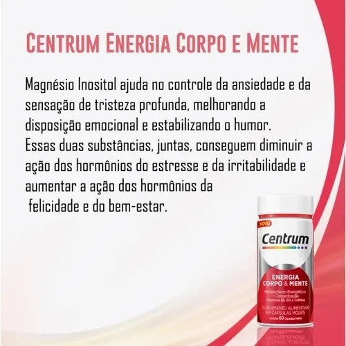 CENTRUM ENERGIA CORPO E MENTE 60 CÁPS ENVIO IMEDIATO!!! PRODUTO 100% ORIGINAL!!!- Indicado para homens e mulheres.- Sustenta os níveis de energia diários do organismo.- Ajuda diária para fornecer energia física e mental.- Auxilia no metabolismo energético e na melhora do foco e concentração.- Contém cafeína e vitaminas B6 e B12.O Centrum Energia Corpo & Mente é um suplemento alimentar de vitaminas e minerais em cápsulas moles, desenvolvido para ajudar a sustentar os níveis de energia diários e auxiliar no metabolismo do organismo adulto.Formulado com Cafeína, vitaminas do Complexo B, Tiamina e Niacina, Centrum Energia Corpo & Mente auxilia o metabolismo energético e contribui para o foco e concentração.Não contém açúcares, glúten e nem quantidades significativas de gorduras saturadas e trans, e seu consumo deve estar associado a uma alimentação equilibrada e hábitos de vida saudáveis.- Como tomar o Centrum Energia Corpo & Mente?Consumir 2 cápsulas ao dia, ou conforme recomendação médica.- AlérgicosContém derivados de soja e pode conter derivados de peixe e amendoim.Não contém glúten, açúcares e nem quantidades significativas de gorduras saturadas e trans.