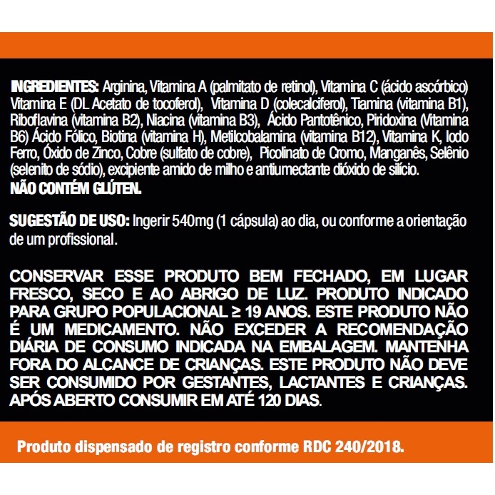 Na Zuchetti Nutrition, entendemos que a nutrição é a base para uma vida mais saudável, equilibrada e ativa. Por isso, nossos suplementos são desenvolvidos com os mais altos padrões de qualidade e segurança para oferecer confiança. Trabalhamos com uma linha completa de produtos pensados para atender suas necessidades, seja para quem busca melhorar o desempenho nos treinos, complementar a alimentação ou alcançar metas de saúde específicas. Nossos diferenciais: • Qualidade Premium: Nossos produtos são feitos com ingredientes selecionados, seguros e de alta qualidade, para garantir uma suplementação eficaz e resultados visíveis. • Inovação e Ciência: Todos os suplementos são desenvolvidos com base em pesquisas científicas, garantindo eficácia e eficiência em cada dose. • Compromisso com o Bem-Estar: A nossa missão é ajudar nossos clientes a atingirem seu melhor potencial físico e mental, com saúde e segurança. Multivitamínico concentrado, completo para mulher. CONTÉM : 120 cápsulas cada pote CONSUMIR DUAS CAPSULAS AO DIA, OU CONFORME ORIENTAÇÃO MÉDICA. INGREDIENTES: INGREDIENTES: Arginina, Vitamina A (palmitato de retinol), Vitamina C (ácido ascórbico) Vitamina E (DL Acetato de tocoferol), Vitamina D (colecalciferol), Tiamina (vitamina B1), Riboflavina (vitamina B2), Niacina (vitamina B3), Ácido Pantotênico, Piridoxina (Vitamina B6) Ácido Fólico, Biotina (vitamina H), Metilcobalamina (vitamina B12), Vitamina K, Iodo Ferro, Óxido de Zinco, Cobre (sulfato de cobre), Picolinato de Cromo, Manganês, Selênio (selenito de sódio), excipiente amido de milho e antiumectante dióxido de silício. NÃO CONTÉM GLÚTEN. SUGESTÃO DE USO: Ingerir 540mg (1 cápsula) ao dia, ou conforme a orientação de um profissional. QUAL É A DATA DE VALIDADE DO PRODUTO? Esse suplemento é fabricado com prazo de validade de 2 anos. Esse produto não é um medicamento Esse produto é um suplemento alimentar em cápsulas Manter fora do alcance das crianças, destinado a pessoas acima de 19 anos Não pode ser consumido por gestantes, lactantes e crianças Produto dispensado de registro conforme RDC 240/2018