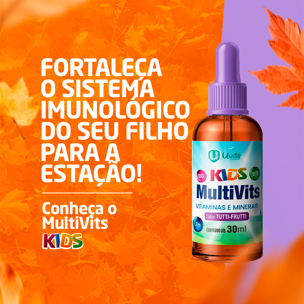 1 Unidade de Multivitamínico Liquido Kids MultiVits 30ml 30 Doses - Uvits Suplemento alimentar que ajuda a prevenir as carências nutricionais da infância O MultiVits Kids 30ml da Uvits é um produto pensado para complementar a alimentação e auxiliar no desenvolvimento das crianças, inserindo vitaminas e minerais que ajudam a promover mais saúde e bem-estar. O Multivitamínico infantil é uma fonte que assegura a inserção de nutrientes como vitaminas e minerais que garantem o bom funcionamento do organismo, ajudando no metabolismo e no aspecto nutricional. Além disso, o suplemento pode auxiliar na imunidade, no metabolismo com as principais vitaminas e minerais essenciais para diversas funções do organismo, como a saúde da pele, saúde óssea, saúde sanguínea e muito mais. Fórmula premium e biodisponível. Sua fórmula em gotas possui sabor suave e agradável de tutti-frutti, tornando a ingestão diária mais fácil e sem desconfortos significativos, além de auxiliar na rápida absorção. Recomendado para crianças a partir de 1 ano, MultiVits Kids oferece doses realmente efetivas de cada nutriente, com o objetivo de otimizar a saúde em todos os níveis para oferecer o melhor para a suplementação na infância. Vitaminas e Minerais presentes no MultiVits Kids: ANTIOXIDANTE: Vitaminas C, E e Zinco SAÚDE SANGUÍNEA: B2, B9 e B12 PRÓ-IMUNIDADE: A, vit. B6, B9, B12, C e D e Zinco AUXILIA NA VISÃO: A, B2 e Zinco SAÚDE ÓSSEA: D e Zinco SAÚDE DA PELE, DAS UNHAS E DO CABELO: A, B3, B2, Zinco e C METABOLISMO ENERGÉTICO: B1, B2, B3, B5 e B6. ⚡ Por ser sublingual, tem rápida absorção pelo organismo. Composição: ✔ Água purificada ✔ Ácido ascórbico (vitamina C) ✔ Gluconato de zinco ✔ Acetato de dl-alfa-to-coferol (vitamina E) ✔ Nicotinamida (vitamina B3) ✔ D-pan-dotenato de cálcio (vitamina B5) ✔ Cloridato de piridoxina (vitamina B6) ✔ Cloridato de tiamina (vitamina B1) ✔ Riboflavina (vitamina B2) ✔ Acetato de retinol (vitamina A) ✔ L-metilfolato de cálcio (vitamina B9) ✔ Colecalciferol (vitamina D3) ✔ Cianocabalamina (vitamina B12) ✔ Aroma idêntico ao natural de tutti-frutti ✔ Conservante sorbato de potássio e edulcorante sucralose 🚫 NÃO CONTÉM GLÚTEN. Alérgicos: PODE CONTER LÁTEX NATURAL E DERIVADOS DE LEITE. Sugestão de Consumo: 1-3 anos, ingerir 0,5 (1/2 dropper) por dia. 4-8 anos, ingerir 1 ml (1 dropper) por dia. Ou conforme orientação de um profissional.