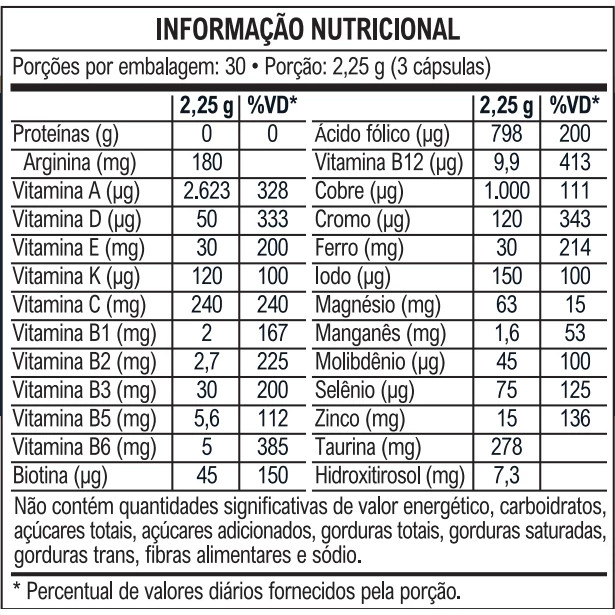 INFORMAÇÕES DE DESTAQUE Suplemento alimentar em cápsulas; Fonte de 13 vitaminas: A, D, E, K, C, B1, B2, B3. B5, B6, B9, B12 e biotina; Fonte de 9 minerais: cobre, cromo, ferro, iodo, magnésio, manganês, molibdênio, selênio e zinco; Contém Extrato de oliva (Oli-Ola™) – Fonte de Hidroxitirosol; Contém taurina e arginina; Alta concentração e biodisponibilidade; Não contém glúten. DESCRIÇÃO MULTIVITAMÍNICO GLP-1 SUPPORT é um suplemento alimentar que combina vitaminas, minerais, taurina, arginina e extrato de oliva (Oli-Ola™), desenvolvido para auxiliar na reposição de micronutrientes e aminoácidos essenciais, contribuindo para o equilíbrio nutricional do organismo. Fórmula inovadora e exclusiva para quem faz uso de análogos de GLP-1. COMPOSIÇÃO Bisglicinato de magnésio (magnésio), L-aspartato de L-arginina (arginina), taurina, ácido ascórbico (vitamina C), bisglicinato ferroso (ferro), extrato aquoso de oliva (Olea Europaea L.), bisglicinato de zinco (zinco), taurato de magnésio (magnésio), acetato de DL-alfa-tocoferol (vitamina E), levedura enriquecida com selênio (selênio), niacinamida (vitamina B3), Colecalciferol (vitamina D), Acetato de retinol (vitamina A), Menaquinona-7 (vitamina K), bisglicinato de manganês (manganês), D-pantotenato de cálcio (vitamina B5), cloridrato de piridoxina (vitamina B6), bisglicinato de cobre (cobre), riboflavina (vitamina B2), cloridrato de tiamina (vitamina B1), picolinato de cromo (cromo), L-metilfolato de cálcio (ácido fólico), metilcobalamina (vitamina B12), iodeto de potássio (iodo), molibdato de sódio (molibdênio), D-biotina (biotina) e antiumectantes dióxido de silício e estearato de magnésio.Cápsula: água purificada, amido modificado, estabilizante hidroxipropilmetilcelulose (HPMC), corante carbonato de cálcio, gelificante carragena e regulador de acidez acetato de potássio. NÃO CONTÉM GLÚTEN. SUGESTÃO DE USO Ingerir 3 cápsulas ao dia ou seguir a recomendação de um profissional da saúde. Suplemento alimentar de uso adulto (a partir de 19 anos de idade).