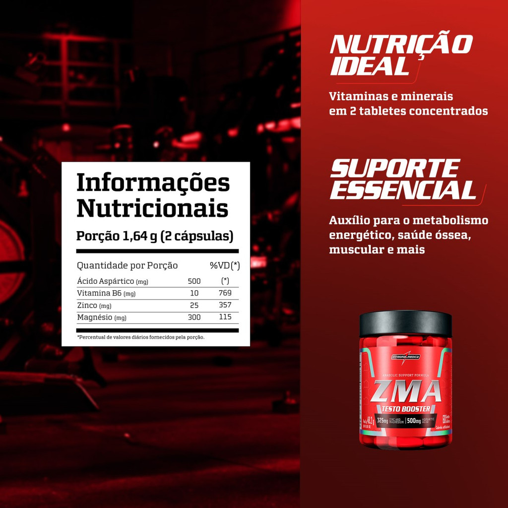 Multivitamínico ZMA - Integralmedica O ZMA da Integralmedica é um suplemento multivitamínico-mineral formulado com a combinação ideal de zinco, magnésio e vitamina B6. Essencial para quem busca melhorar o desempenho físico, a recuperação muscular e a saúde hormonal, o ZMA atua diretamente no fortalecimento do sistema imunológico e na regulação de funções metabólicas importantes. Indicado para atletas e praticantes de atividades físicas, auxilia também na qualidade do sono e no ganho de força e massa muscular. Benefícios: Apoio à Performance Física: O zinco e o magnésio presentes na fórmula são fundamentais para a síntese de proteínas, produção hormonal e recuperação muscular, favorecendo o ganho de força e massa magra. Fortalecimento Imunológico: O ZMA contribui para o bom funcionamento do sistema imunológico, auxiliando na proteção do organismo contra infecções e doenças, especialmente em momentos de treinamento intenso. Equilíbrio Hormonal: A combinação dos nutrientes promove a manutenção de níveis hormonais adequados, incluindo a otimização da produção natural de testosterona, essencial para a performance esportiva. Melhora na Qualidade do Sono: O magnésio e a vitamina B6 colaboram para um sono mais reparador, o que favorece a recuperação muscular e a disposição para os treinos seguintes. Fácil Consumo e Praticidade: Disponível em cápsulas, o ZMA da Integralmedica é prático, com dosagem precisa, facilitando a inclusão na rotina diária de suplementação. Informações Técnicas: Peso Líquido: 60g. Quantidade: 60 cápsulas. Principais componentes: Zinco, Magnésio e Vitamina B6. Indicação: Suplementação de nutrientes essenciais para saúde, desempenho físico e imunidade. Conservação: Armazenar em local seco e fresco. Sobre nós: Desde 1983, a Integralmedica é referência no segmento de suplementação esportiva, oferecendo produtos inovadores, seguros e eficazes. A marca patrocina atletas e eventos esportivos de renome, sempre comprometida com a saúde e o desempenho de seus consumidores. Com foco em qualidade, tecnologia e pesquisa, a Integralmédica desenvolve soluções que aliam ciência, bem-estar e performance para quem busca superar seus limites com segurança e confiança.
