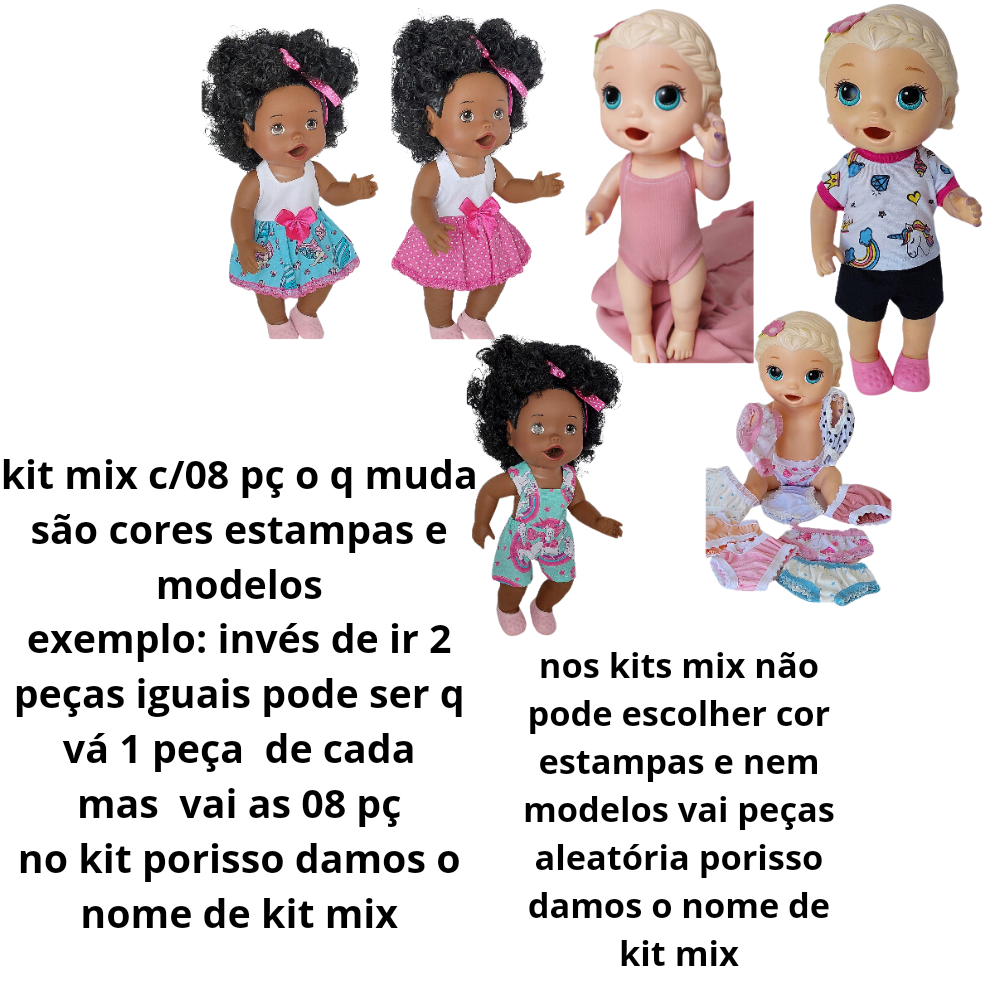 VENDA DE ROUPINHAS PARA BONECAS KIT MIX PARA MAMÃES Q NÃO TEM MUITO TEMPO PRA FICAR ESCOLHENDO PEÇAS DE ROUPINHAS PARA AS BONECAS PENSANDO NA PRATICIDADE CRIAMOS O KIT MIX ELE OFERECE UM MIX DE VARIEDADES DE ROUPINHA COM CORES,ESTAMPAS E MODELOS DIFERENTES OBS: A BONECA ASSIM COMO OS ACESSORIOS LAÇO DE CABELO E SAPATINHO NÃO ESTÁ A VENDA. O QUE SERIA O KIT MIX? O KIT MIX É UM MIX DE ROUPINHAS COM CORES ESTAMPAS E MODELOS VARIADOS PODENDO SER CONJUNTO OU PEÇAS AVULSAS ISSO DEPENDE DA DISPONIBIDADE DO ESTOQUE TODAS DE EXCELENTE QUALIDADE. O QUE VAI NO KIT MIX ? VAI PEÇAS VARIADAS PODENDO ESCOLHER APENAS OS TAMANHOS VEJA LOGO ABAIXO AS POSSIVEIS PEÇAS QUE VAI NO KIT MIX. NESTE KIT CONTÉM; 08 PEÇAS AVULSAS QUE SERÃO ENVIADAS PEÇAS ALEATORIAS BLUSAS MANGA LONGA OU MANGA CURTA CALÇA OU SHORT MAIÔ MACACÃO DE CALOR CALCINHAS VESTIDOS TODAS AS PEÇAS SÃO DE EXCELENTE QUALIDADE PODENDO APENAS ESCOLHER O TAMANHO NAS VARIAÇÕES GARANTIMOS QUE NÃO IRÁ NEM UMA PEÇA REPETIDA. NO ANÚNCIO TEM UMA FOTO COM 4 MODELOS DE BABY ALIVE COM OS TAMANHOS E AS MEDIDAS ABAIXO PRA FACILITAR A ESCOLHA DO TAMANHO EXATO E ASSIM EVITAR POSSIVEIS TROCAS. NÃO PODENDO ESCOLHER COR , ESTAMPAS NEM MODELOS SERÃO ENVIADAS PEÇAS DISPONIVEIS NO ESTOQUE