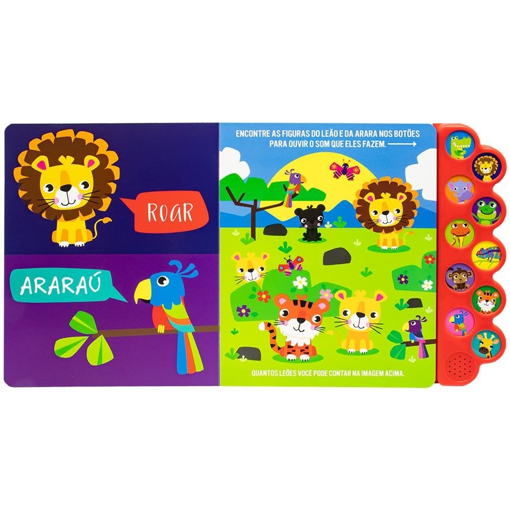 Um livro procure e encontre divertido e barulhento, com ilustrações vivas e atraentes, que se conectam a botões sonoros. A DIVERSÃO COMEÇA QUANDO VOCÊ PRESSIONAR OS BOTÕES E OUVIR UM ROAR OU UM SQUAWK! 29x28cm 10 Páginas