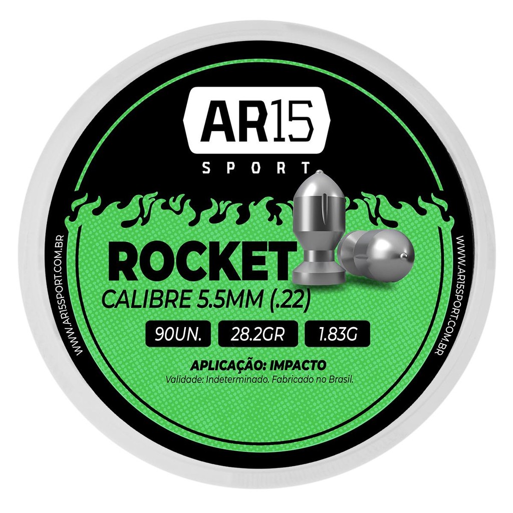 ESPECIFICAÇÕES TÉCNICAS: - Marca: Ar15 Sport - Modelo: ROCKET - Calibre: 5.5mm (.22) - Quantidade: 90 unidades - Peso: 1.83 gramas - Gramatura: 28.2 grains - Material: Chumbo - Aplicação: Impacto - Comprimento: 11,6mm - Peso bruto total caixa: 187 gramas ITENS INCLUSOS: - 02 Chumbinho Ar15 Sport ROCKET 5.5mm 90un. Observação: Garantia de 03 meses mediante defeitos de fábrica.