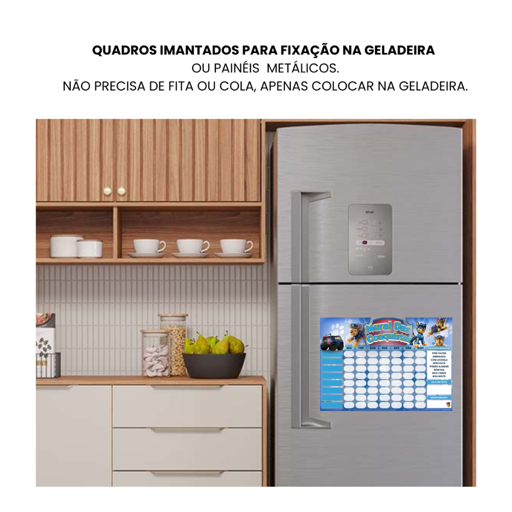 Ferramenta educativa recomendada por especialistas: O quadro de incentivo e rotina ajuda a melhorar comportamentos infantis de forma lúdica e eficaz. Kit completo e pronto para uso: Inclui quadro magnético, 60 carinhas felizes, 40 tristes, 30 tarefas, 10 tarefas personalizáveis e 10 estrelas tudo recortado e pronto. Brinde de todos os personagens do Quadro como imãs para fixar juntos. Material de alta qualidade: Feito com verso imantado e frente em vinil adesivo com impressão digital, garantindo durabilidade e praticidade. Personalização flexível: Acompanha 30 regras magnéticas, podendo ser substituídas ou reorganizadas sem danificar o material. Tamanho e aplicação: Mede 30x22 cm e deve ser fixado em superfícies metálicas (não indicado para paredes ou geladeiras inox/plotadas). Estímulo à autonomia infantil: Incentiva hábitos saudáveis e atitudes positivas como escovar os dentes, dividir brinquedos, obedecer aos pais, entre outros. Tamanho: 30cm largura x 22cm de altura.