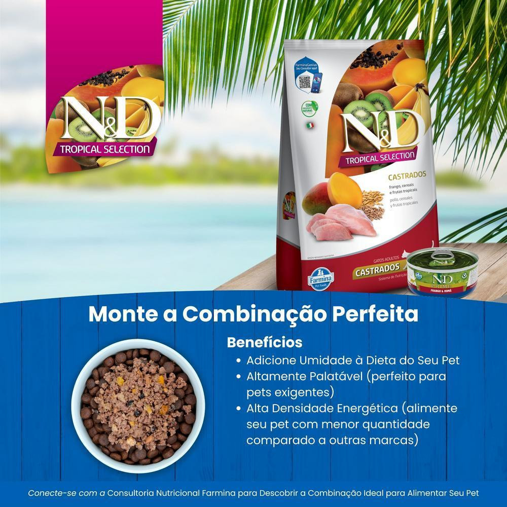 N&D Tropical para Gatos Adultos Castrados de Todas as Raças Sabor Frango, Cereais e Frutas Tropicais 400g