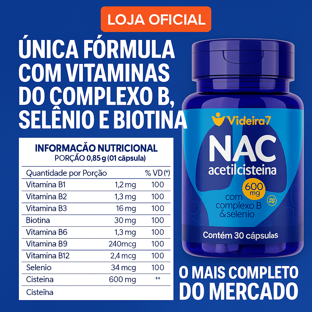 N-Acetil L-Cisteína 600mg com Vitaminas B1, B2, B3, B5, B6, B9 e B12, Biotina e Selênio 30CÁPS VIDEIRA7. Fórmula mais completa, melhor custo benefício. ✅ PRODUTO ORIGINAL - ENVIADO COM AMPLA VALIDADE, ATÉ 2 ANOS APRESENTAÇÃO: NAC® é um suplemento alimentar composto pelo aminoácido N-acetil L-cisteína (NAC) isolado. INGREDIENTES: N-acetilcisteína, Nitrato de tiamina (Vitamina B1), Riboflavina (Vitamina B2), Niaciamida (Vitamina B3), Biotina, Cloridrato de piridoxina (Vitamina B6), Ácido pteroilmonoglutamico (Vitamina B9), Pantotenato de cálcio (Vitamina B5), cianocobalamina (Vitamina B12) e selenito de sódio. O que vem neste produto? Suplemento alimentar de acetilcisteína em cápsulas com Vitaminas B1, B2, B3, B5, B6, B9 e B12, Biotina e Selênio. NAC 600mg + Complexo B + Selênio + Biotina – Fórmula Completa Desenvolvido para oferecer uma composição estratégica que reúne ativos amplamente utilizados para suporte metabólico e nutricional. Diferenciais: ✔ Combinação completa em uma única cápsula ✔ Mais praticidade no dia a dia ✔ Fórmula pensada para suporte nutricional ✔ Cápsulas fáceis de ingerir Produto ideal para quem busca praticidade e uma composição mais completa em comparação às versões isoladas. O que é N-Acetilcisteína (NAC) ? A N-Acetilcisteína é um derivado do aminoácido cisteína. Vitamina B1 - auxilia no metabolismo energético; Vitamina B2 - contibui para a manutenção da pele e mucosas, auxilia na formação de células vermelhas do sangue e é um antioxidante que auxilia na proteção dos danos causados por radicais livres; Vitamina B3 - auxilia na manutenção de mucosas, no metabolismo energético e contribui para a manutenção da pele; Vitamina B5 - auxilia no metabolismo energético; Vitamina B6 - auxilia no funcionamento do sistema imune, na síntese de cisteína, na formação das células vermelhas do sangue e no metabolismo energético; Vitamina B9 - auxilia no funcionamento do sistema imune, na formação de células vermelhas do sangue, no metabolismo de proteínas, carboidratos e gorduras e na síntese de aminoácidos; Vitamina B12 - auxilia no funcionamento do sistema imune, na formação de células vermelhas do sangue, no metabolismo energético, no metabolismo da homocisteína e no processo de divisão celular; Biotina - é uma vitamina hidrossolúvel. Ela auxilia na manutenção das mucosas; Selênio - Auxilia no funcionamento do sistema imune. É um Antioxidante que auxilia na proteção dos danos causados pelos radicais livres; Recomendação de Uso: Consumir 01 cápsula por dia. Cuidados de Conservação: Manter o produto em lugar seco e arejado. Após aberta a embalagem, manter a tampa bem fechada para garantir as características do produto. Recomenda-se o consumo em até 90 dias. Produto isento de registro em conformidade com o anexo I da RDC 27/2010, e com a EDC 23/2000 da ANVISA.