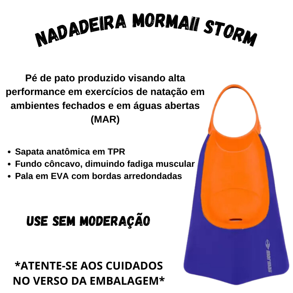 NADADEIRA PÉ DE PATO STORM MORMAII PRODUTO ORIGINAL E A PRONTA ENTREGA Compre agora sua Nadadeira de natação Mormaii Storm. Lançamento 2024, possui alta tecnologia! Nadadeira feita em borracha super macia e elástica, que acomoda os pés com total conforto. Abas flexíveis e especificas para treinos de natação.Fortalecimento da musculatura das pernas. Maior gasto calórico e melhoria da aptidão física. Aumento da flexibilidade das articulações. Melhora da flutuabilidade e posicionamento do corpo no nado. Facilita a aprendizagem e desenvolvimento das técnicas de Natação. Tamanhos disponíveis: Tamanho PP/XS - (33/34) Tamanho P/S - (35/36) Tamanho M/M - (37/38) Tamanho G/L - (39/40) Tamanho GG/XL - (41/42) Tamanho XGG/XXL - (43/44) Cuidados: Após o uso lave a nadadeira/pé de pato em agua corrente e limpa. Deixe secando na sombra e evite guardar a peça totalmente molhada MORMAII:A história da Mormaii começa nas belas praias da região sul do litoral brasileiro no início dos anos 70, fundada pelo então médico e surfista Morongo. Surge, assim, uma marca com raízes no surfe, mas com um objetivo maior: a busca pela qualidade de vida. Atualmente, a marca é reconhecida por mais de uma centena de produtos que atendem as categorias Surf, Mergulho, Skate, Fitness, Moda Praia, Bicicletas, além de produtos como óculos, relógios e chinelos, entre outros, tornando a Mormaii a maior e mais querida marca de esportes livres do Brasil