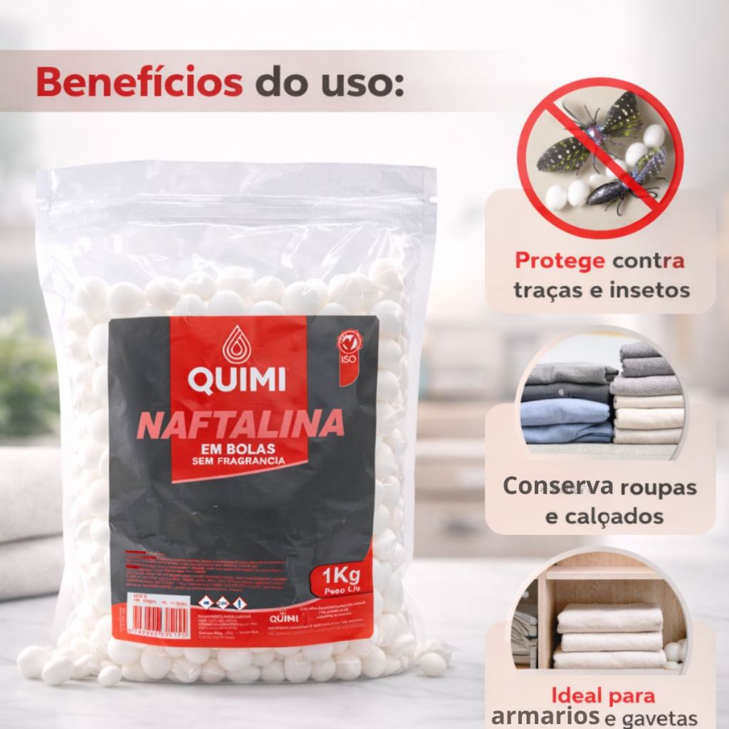 O que você irá receber: 1 Pacote de Naftalina em Bolas 1Kg. A Naftalina em Bolas Quimi é indicada para proteger roupas, calçados e tecidos armazenados contra traças e insetos. Sua ação é eficaz em ambientes fechados, ajudando a conservar peças guardadas por mais tempo. O formato em bolas facilita a distribuição nos locais de uso, permitindo uma aplicação prática e controlada. Produto sem fragrância, ideal para quem prefere proteção sem perfume forte. Indicado para uso em: Guarda-roupas Armários Gavetas Sapateiras Baús e locais fechados Benefícios: Ajuda a proteger contra traças e insetos Contribui para a conservação de roupas e calçados Fácil de usar e distribuir Produto sem fragrância
