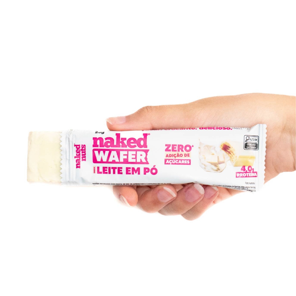 Naked Wafer: Wafer Branco com Naked de Leite em Pó (caixa com 12 unidades) Chegou o Naked Wafer! O seu novo wafer preferido, recheado com a nossa famosa pasta de Leite em Pó. O Naked Wafer é uma expansão do Nakedverso para fora do mundo das pastas e um passo mais próximo da dominação mundial, rs! Pensamos em todo mundo: quem gosta de um snack no trabalho, no cinema, na estrada, em qualquer lugar! E até mesmo os que são Team Chocolate Branco ou Team Chocolate ao Leite (sim, ele tem 2 versões)! Nossos dois sabores são: ZERO AÇÚCAR e com WHEY PROTEIN. Além de um delicioso gostinho de infância. QUANTIDADE A caixa contém 12 unidades do Naked Wafer com cobertura de chocolate branco, e recheado com a pasta de Mix de Nuts sabor Leite em Pó. QUANDO COMER NAKED WAFER? No café da manhã, no pré e pós treino, no cineminha, nas receitas, no trabalho, na hora da sobremesa, on the road, quando bater a larica… Onde seu coração mandar, o Naked Wafer está lá pra matar a sua fome! INGREDIENTES Chocolate branco zero adição de açúcar (manteiga de cacau, leite em pó integral, soro de leite, edulcorante natural maltitol, emulsificante INS 322 e INS 476, edulcorante artificial sucralose e aromatizantes), wafer, castanha de caju, amendoim, leite em pó e proteína concentrada do soro de leite. ** CONTÉM GLÚTEN, CONTÉM LACTOSE ** Contém açúcares próprios dos ingredientes. Esse não é um alimento de baixo ou reduzido valor energético. ALÉRGICOS Contém: amendoim, castanha de caju, derivados do leite, derivados de trigo e soja. Pode conter aveia (sem glúten), ovos, amêndoa, pistache, avelã, pinoli, castanha do pará, macadâmia, pecã e nozes. VOCÊ TAMBÉM VAI AMAR: Não se esqueça de provar nosso outro sabor de Naked Bites: Wafer de Chocolate com Naked de Leite em Pó! Ah, e já que está por aqui, por quê não provar também a pasta de Leite em Pó? Ela é nosso recheio secreto ;)
