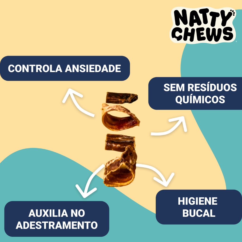 O Misturita Natty Chews é um petisco natural premium em porção de 100 g composto por recortes bovinos desidratados de traqueia e esôfago. Ideal para cães de todos os portes e idades, apresenta textura firme que estimula o instinto de mastigação, favorecendo distração prolongada e contribuindo para a higiene bucal ao auxiliar na remoção da placa bacteriana e no controle do mau hálito. Sem adição de conservantes, corantes, palatabilizantes ou transgênicos, este petisco promove uma experiência saudável e saborosa. Use como reforço de recompensa, enriquecimento ambiental ou atividade de mastigação que entretém e apoia o comportamento positivo do cão. FICHA TÉCNICA Apresentação: embalagem com 100 g Ingredientes principais: recortes bovinos de traqueia e esôfago desidratados Fórmula: 100 % natural, sem conservantes, sem corantes, sem palatabilizantes artificiais, livre de transgênicos Benefícios principais: estimula a mastigação, favorece higienização bucal, reduz ansiedade e tédio Público-alvo: cães de todas as idades e portes Finalidade: petisco para recompensa ou entretenimento prolongado CUIDADOS COM O PRODUTO Ofereça de acordo com o porte e nível de atividade do cão Sempre mantenha água fresca à disposição do animal Armazene o produto em local seco, protegido da luz direta e bem fechado após cada uso Supervisione a mastigação principalmente em filhotes ou cães de pequeno porte Produto destinado exclusivamente para cães e não consumo humano