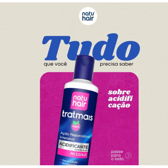 Acidificante NatuHair TratMais Vegano 300ml Vegano Reduz aspecto poroso e promove brilho aos fios opacos. Vinagre de Maçã + Manteiga de Karité Uso Profissional Sela as Cutículas / Equilibra o pH / Pós Processos Químicos / Vegano / Reduz aspecto poroso e promove brilho aos fios opacos. Para cabelos fragilizados, porosos e quimicamente tratados. O Acidificante NatuHair TratMais é um tratamento profissional com fórmula desenvolvida para revitalizar cabelos que estão porosos, desvitalizados ou que passaram por processos químicos. Possui Vinagre de Maçã e Manteiga de Karité que controla o pH do fio, sela as cutículas, hidrata, neutraliza a porosidade, conferindo brilho e maciez. Modo de usar: Após lavar o cabelo com shampoo, remova o excesso de água com uma toalha e aplique o Acidificante NatuHair TratMais mecha por mecha. Massageie por todo o comprimento e penteie para distribuir, deixando agir por 3 minutos. Enxágue em seguida e aplique uma máscara de tratamento ou condicionador, finalizando como de costume. Composição: Aqua, Behentrimonium Methosulfate, Cocos Nucifera Oil, Cetearyl Alcohol, Glyceryl Stearate, Phenoxyethanol, Vinegar, Pyrus Malus (Apple) Fruit Extract, Fructose, Glucose, Gluconic Acid, Gluconoloctone, Caesalpinia Spinosa Gum, Cetrimonium Chloride, Parfum, Butyrospermum Parkii (Shea Butter, Zea Mays Starch, Disodium EDTA, Lactic Acid, DMDM Hydantoin, d-Limonene, Linalool.