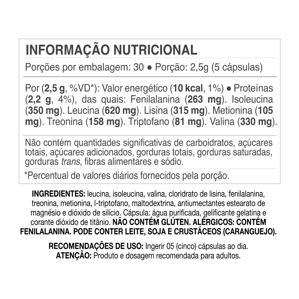 H50+ Doutor Nature Desenvolvido pelo Dr. Fausto Almeida, cada porção possui 8 Aminoácidos Essenciais: Leucina, Isoleucina, Lisina, Valina, Fenilalanina, Treonina, Metionina e Triptofano. Fórmula em cápsulas, sem glúten, pensada para quem valoriza vitalidade e qualidade de vida em todas as fases da vida. O que é O Nature H50+ é um suplemento alimentar em cápsulas com fórmula exclusiva de 8 aminoácidos essenciais. Cada pote traz 150 cápsulas, equivalentes a 30 porções práticas para o dia a dia. Em cada porção, são 2,2 g de aminoácidos em perfil balanceado, pensado para oferecer suporte nutricional de qualidade em uma rotina ativa e madura. Destaques do produto 2,2 g de aminoácidos essenciais por porção Fórmula completa com 8 aminoácidos essenciais Embalagem com 150 cápsulas (30 porções) Sem glúten Linha H50+ - Original Doutor Nature Fórmula desenvolvida em parceria com o Dr. Fausto Almeida Como consumir Conforme instruções do rótulo: ingerir 5 cápsulas ao dia, com água. Informação nutricional (porção de 2,5g) Proteínas: 2,2 g (4% VD) Leuci na: 620 mg Isoleucina: 350 mg Lisina: 315 mg Valina: 330 mg Fenilalanina: 263 mg Treonina: 158 mg Metionina: 105 mg Triptofano: 81 mg Valor energético: 10 kcal (1% VD) Não contém quantidades significativas de carboidratos, açúcares, gorduras totais, gorduras saturadas, gorduras trans, fibras alimentares e sódio. Avisos importantes Produto destinado a adultos (idade mínima recomendada: 19 anos) Não é medicamento Não trata, previne ou cura doenças Siga a dosagem recomendada no rótulo Conserve em local seco, fresco e protegido da luz