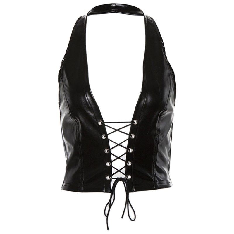 nava Punk Mangas Crop Decote V Backless Oco Colete Couro Cruzado Lace-Up Parte