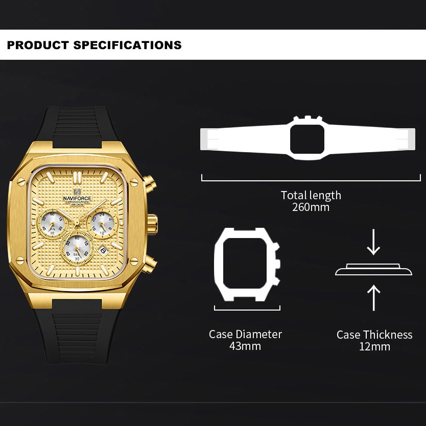 NAVIFORCE 8037 Homens Observam Postos De Moda De Negócios Gold Silicone Strap Wristwatch Cronógrafo Multifuncional Relógio Luminoso À Prova D'água