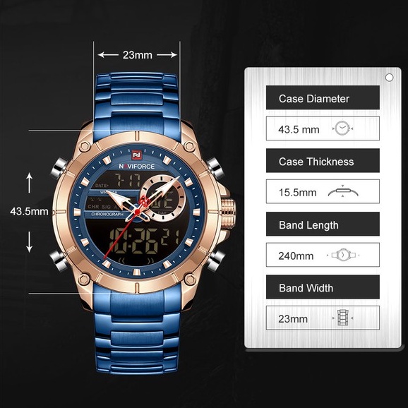 Descrição do produto em inglês após português Nome da marca: NAVIFORCE Número do modelo: NF9163 Comprimento da banda: 24 cm Estilo: ESPORTE Movimento: QUARTZ Movimento: exibição dupla Profundidade de resistência à água: 3Bar Tipo de Fecho: Fecho dobrável com segurança Material da Caixa: Prata Espessura da caixa: 15,5 mm Tipo de Material da janela do mostrador: Hardlex Tipo de Item: relógios de pulso de quartzo Tipo de Material da Banda: AÇO INOX Diâmetro do Mostrador: 43,5mm Largura da banda: 22mm Forma do estojo: REDONDO Característica: Luz de fundo Característica: Data Automática Característica: Calendário Completo Característica: Resistente à água Conteúdo do pacote: - 1 x relógio NAVIFORCE - 1 x manual do usuário do cartão de garantia Sugestão: Após receber o relógio, recomenda-se que o comprador limpe a superfície do relógio com um pano para evitar que a umidade adera à superfície durante o transporte; quando não estiver usando, limpe o suor da superfície com um pano Antes de colocá-lo, e em seguida coloque-o em um ambiente seco para evitar o suor humano ou umidade O ambiente faz com que o relógio oxida ************************************************** Brand Name : NAVIFORCE Model Number : NF9163 Band Length : 24cm Style : SPORT Movement : QUARTZ Movement : Dual Display Water Resistance Depth : 3Bar Clasp Type : Folding Clasp with Safety Case Material : Silver Case Thickness : 15.5mm Dial Window Material Type : Hardlex Item Type : Quartz Wristwatches Band Material Type : STAINLESS STEEL Dial Diameter : 43.5mm Band Width : 22mm Case Shape : ROUND Feature : Back Light Feature : Auto Date Feature : Complete Calendar Feature : Water Resistant Package Contents: - 1 x NAVIFORCE watch - 1 x warranty card user manual Suggestion: After receiving the watch, it is recommended that the buyer wipe the watch surface with a cloth to prevent moisture from adhering to the surface during transportation; when not wearing, wipe the surface sweat with a cloth before placing it, and then place it in a dry environment to prevent human sweat or moisture The environment causes the watch to oxidize
