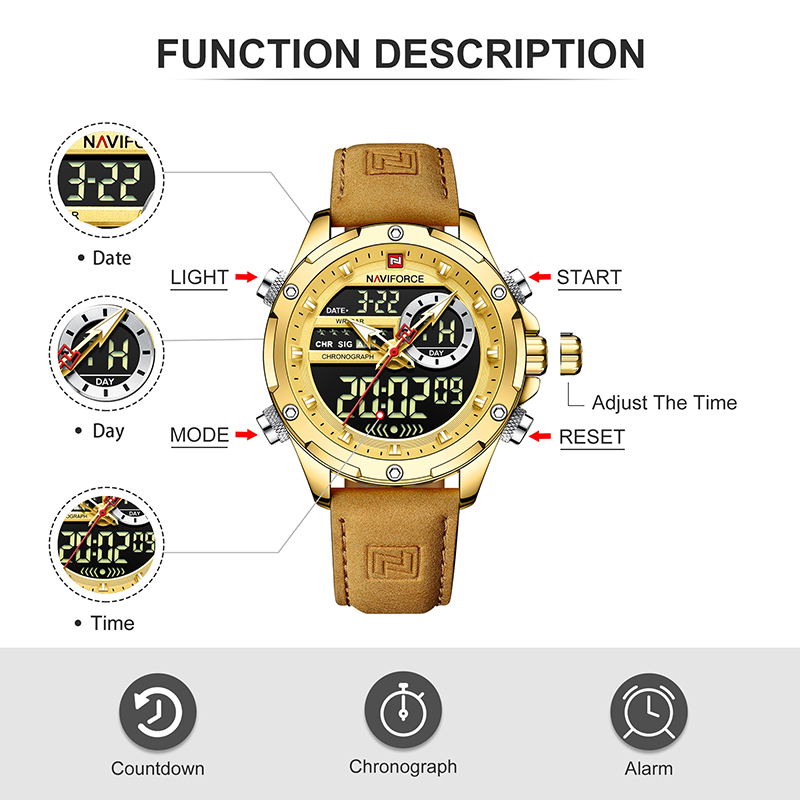 NAVIFORCE 9208 Relógio Cronógrafo Multifuncional De Pulso De Couro De Fuso Horário Duplo Com Estilo Para Homens