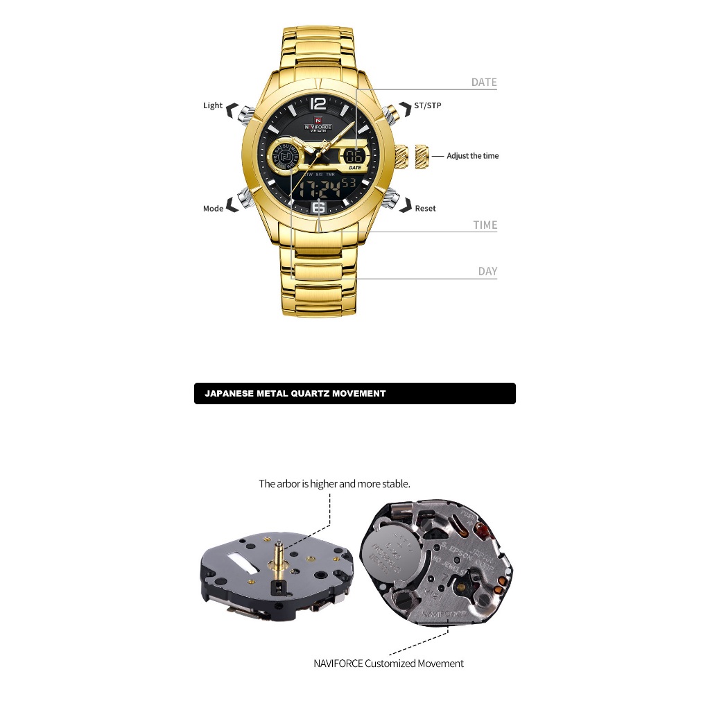 NAVIFORCE 9232 Relógio De Moda Masculina Tendência Multi-Funcional Fivela Dobrável De Aço Inoxidável