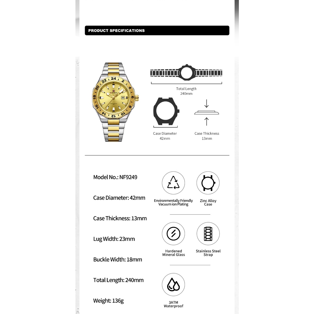 Descrição Movimento de movimento de alta qualidade: Movimento Seiko: Movimento Seiko, 100% novo de alta qualidade, economia de energia e durável. À prova d'água: 30m 98FT resistente à água diária, adequado para uso diário, lavagem à mão, dias chuvosos, respingos ou mergulho curto, SEM problemas. Não suporta banho e natação, não opere o relógio subaquático, (Obs: Por favor, não opere o botão na água) Material do vidro mineral de alta dureza (chave resistente a arranhões), caixa de liga, cabo de aço inoxidável, caixa de aço inoxidável de volta, resistente à pressão Ideias de Presente: relógios são para Natal, Aniversário, Dia dos Pais, Dia de Graduação e Dia dos Namorados ou como presente para negócios e festas. Atendimento a: Qualquer dúvida sobre o produto, entre em contato conosco, ofereceremos o melhor atendimento!Qualquer dúvida sobre o produto, entre em contato conosco, ofereceremos o melhor atendimento! ——————————————————————————————————————— Nome da marca: NAVIFORCE Modelo: NF9249 Características da Embalagem: Impermeável Movimento do movimento do quartzo: movimento do quartzo Estilo: casual moderno, esportivo, empresa, luxo Profundidade à prova d'água: 3Bar (não suporte chuveiro e natação, não opere o relógio subaquático); Forma da concha: redondo Características principais: - 100% novo e de alta qualidade; Mostrador de design de luxo de alta qualidade com display de data; Material de proteção: liga de zinco Tipo de material de janela giratória: Hardlex Material da alça de alça: Sílica Material da tampa inferior do fundo: Aço inoxidável Tipo de fivela: fivela Especificações aproximadas): - Diâmetro do Mostrador: 42 mm - Largura do mostrador: 18 mm Espessura da Caixa: 13 mm - Comprimento do mostrador: 240 mm Peso: 136 g Incluído no Pacote: 1 x relógio NAVIFORCE 1 x Descrição (inglês)