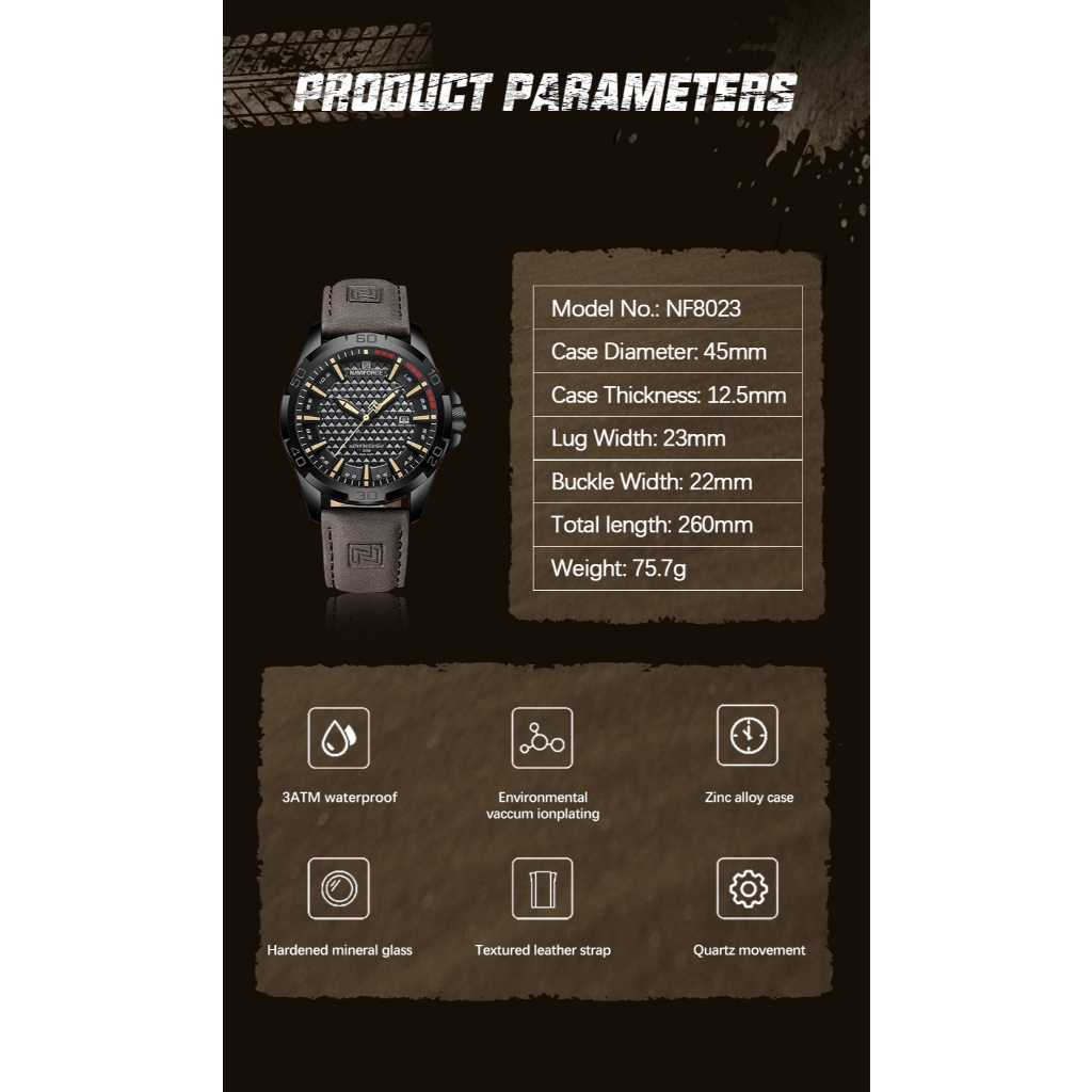 Modelo do modelo: NAVIFORCE NF8023 Máquina de máquina: Movimento de calendário de quartzo Gênero: Homens e Homens e Relogio Masculino Estilo: Moda e Casual e Negócios e Luxo Tipo de Material do Mostrador de Mostrador: Vidro Mineral Endurecido Tipo de Material da alça da alça: Cinta PU tipo: Cinta PU Tipo de Fecho: Fivela Diâmetro do Mostrador: 45mm Espessura da caixa: 12,5 mm Comprimento da alça de alça de alça de comprimento: 260mm Largura do Lug Lug: 23mm Largura da Alça de Alça de Largura: 22mm Peso do Produto: 75,7g Características: Resistente à água 30M e Resistente a Choques, Display de Data, Movimento de Calendário de Quartzo Desgaste diário adequado para todas as modas, casuais, festas ou desgaste diário. O produto do produto de instruções inclui: Relógio Original * 1, Manual de instruções * 1,
