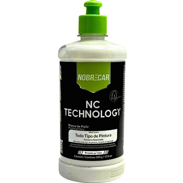 MASSA DE POLIR NC TECHNOLOGY NOBRECAR Massa de Polir inovadora e altamente tecnológica, possui micro abrasivos híbridos de primeira qualidade que se adaptam automaticamente à dureza da superfície, por isso ela oferece um corte incomparável no mercado e promove um acabamento liso e livre de imperfeições. MODO DE USO: Coloque quatro gotas pequenas sob a boina (de lã ou de espuma). Sobre a superfície limpa e seca, espalhe o produto uniformemente numa área aproximada de até 60 x 60 cm iniciando o processo de polimento em velocidade baixa. Trabalhe em movimentos lentos para a direita e esquerda. Em velocidade média utilize no máximo 1800 rpm. Finalize em velocidade baixa, retire o excesso com pano limpo de microfibra e faça uma inspeção com Nobrecar X-9. Caso necessário repita o processo.