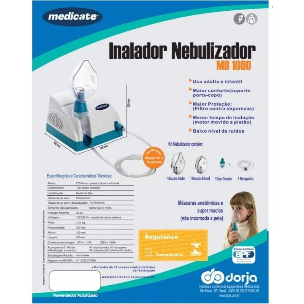 NEBULIZADOR INALADOR MEDICATE MD1000 BRANCO Verde BIVOLT ENVIO IMEDIATO !!!!! O inalador Nebulizador Ultrassônico Medicate é portátil, sendo indicado para uso residencial Ele não utiliza copo descartável para deposição do medicamento: Conta.com design inovador sendo leve e de fácil manuseio Acompanha máscara de uso adulto e mascara infantil. Qinalador ou nebulizador é o aparelho utilizado para malação de medicamentos, por meio de vapores que chegam aos pulmões e penetram nos bronquios. Dessa forma, ele é extremamente eficaz para tratamento de problemas respiratórios sejam em bebés, crianças, adultos ou idosos. O inalador ultrassônico é mais moderno e silencioso. Ele é capaz de quebrar as moléculas do medicamento, produzindo uma névca que é absorvido mais rapidamente pelo organisma Outra vantagem do inalador ultrassonico MD 3000, é que ele pode ser usado em qualquer posição que o paciente estega, inclusive destado, proporcionando conforto e segurança BENEFÍCIOS: -Tecnologia: controle inteligente de temperatura de operação -Sensor de falta de liquidos no recipiente: -Econômica baxo consumo de energia: -Ecologicamente correto não utiliza copos descartáves -Design inovador portant -Prática silencioso leve e de facil manuseio -Versátil.com 2 tamanhos de máscaras, pode ser utilizado em adultos e crianças Indicado para doenças adquiridas pelas vias respiratórias: Para crianças, adultos e idosos. INFORMAÇÕES ADICIONAIS: O inalador ultrassônico é o mais moderno e silencioso que o inalador de ar comprimido. Ele é capaz de quebrar as moléculas do medicamento, produzindo uma névoa que é absorvido mais rapidamente pelo organismo. Outra vantagem desse inalador é que ele pode ser usado em qualquer posição que o paciente esteja, inclusive deitado. Não se pode utilizar no inalador ultrassonico medicamentos do tipo corticoide, muito utilizados para evitar crises de asma Esses medicamentos perdem a eficacia quando utilizados no aparelho ultrassonico. O aparelho pode ser usado sem nenhum problema para inalação de soro fisiológico e broncodilatadores Osmais connecidos desta classe de medicamentos são o brometo de ipratropio (Atrovent), bromidrato de fenoterol (Beratec) eo sulfato de salbutamol (Aerolin CONSERVAÇÃO -Antes de manusear o equipamento e a medicação deve-se sempre lavar as mãos.com sabito cestro e secar be -Desmontar e lavar a máscara com água e detergente neutro -Higienizar com clorexidina ou de molho em polução de hipoclorito de sodio todas as vezes que usar. decor separantes de guardar -Mangueira colocar de moto em água com 1 colher de hipoclorito de sodio por 1 h, dear secare armazenar num saco protetor -Guardar na caixa ou em local protegido de poera e particulas INFORMAÇÕES TÉCNICAS: -Inalador Ultrassonico-MD-Medicate: -Modelo: MD300, -Carcaça em ABS Policarbonato; -Placa eletrônica microcontrolada, incorpora fluxo de ar (ventilação positiva). -Sensor de falta de líquido no recipiente, -Desligamento automático em 10 min, -Baixo consumo de energia (40VA): -Frequencia de operação 2.5MHZ. -Voltagem Bivolt automatica