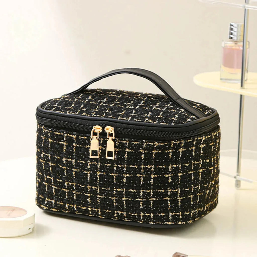 👜 Bolsa de Maquiagem de Grande Capacidade para Viagem | Necessaire Feminina Luxo Tweed ✨ Descrição do Produto: Leve praticidade e elegância para suas viagens com esta bolsa de maquiagem de grande capacidade, ideal para armazenar cosméticos, produtos de beleza, skincare e itens de higiene pessoal. Fabricada com material tweed de alta qualidade, apresenta fios pretos e dourados entrelaçados, criando um visual sofisticado e moderno. 🔹 Características: Tipo: Estojo de maquiagem / Necessaire de viagem / Bolsa de cosméticos Material: Tweed texturizado com fios pretos e dourados Fechamento: Zíper dourado de alta resistência Detalhes: Dois puxadores metálicos na cor dourada, design elegante e funcional Medidas: 21 cm (comprimento) × 14 cm (largura) × 14 cm (altura) 💄 Destaques: Grande capacidade interna para guardar maquiagens, pincéis, perfumes e cremes Ideal para viagens, academia ou uso diário Compacta, leve e fácil de transportar Design sofisticado que combina beleza e praticidade 🎁 Perfeita para presente! Uma necessaire charmosa e funcional para quem ama organização e estilo.
