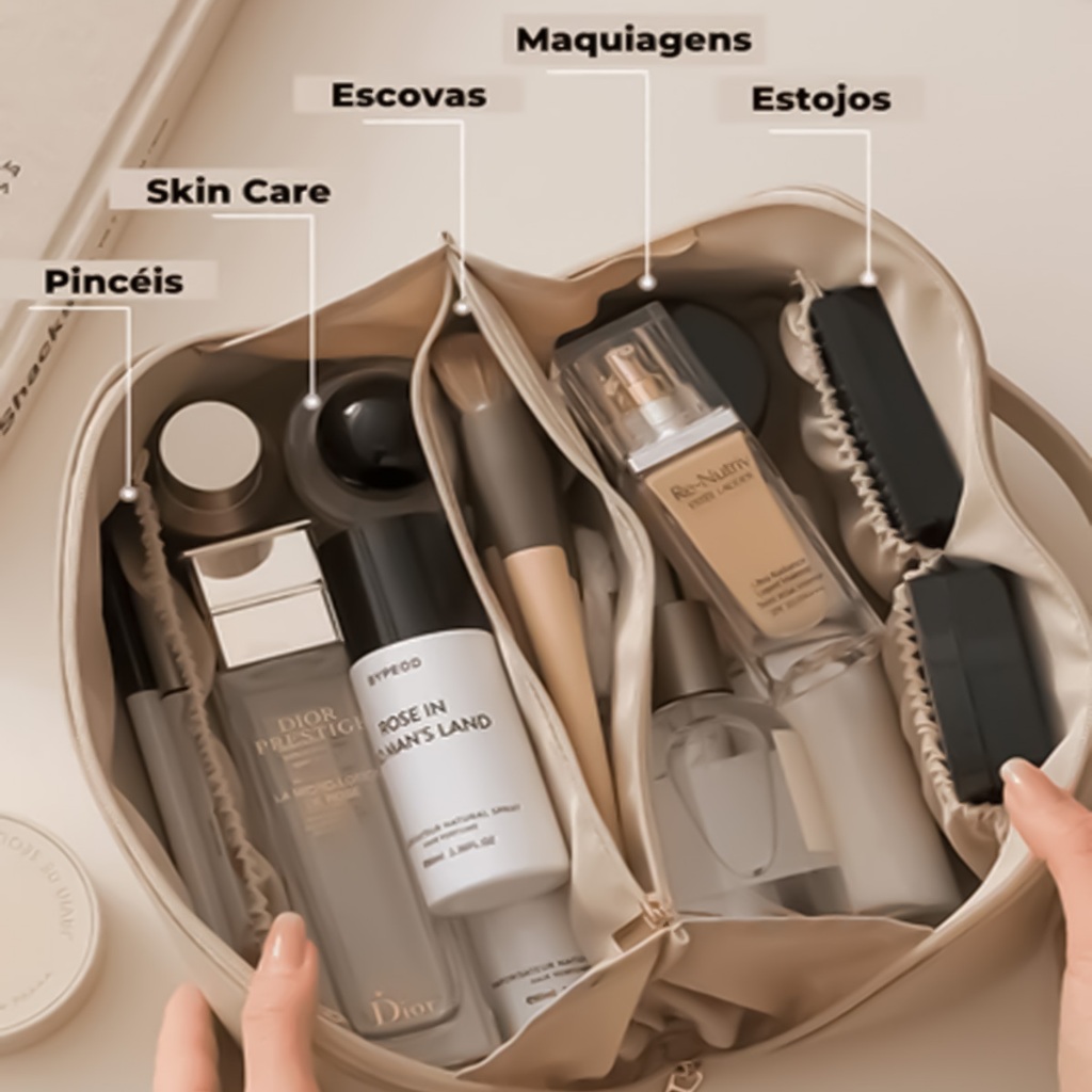 Necessaire organizadora, maquiagem, cosméticos, organização, beleza, viagem, praticidade, beleza