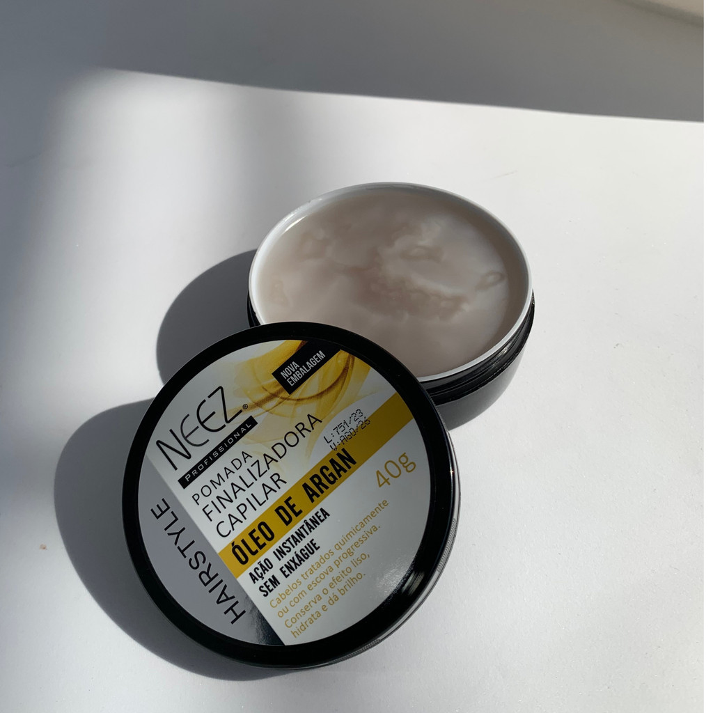 ÓLEO DE ARGAN Experimente a pomada finalizadora de Óleo de Argan da linha Hair Style da Neez para cabelos tratados quimicamente ou com escova progressiva. Sua fórmula, elaborada com óleos e ceras naturais, hidrata, repõe o brilho e mantém o efeito liso. Com ação instantânea e sem necessidade de enxágue, proporciona conservação do efeito liso, hidratação e brilho aos fios. Modo de usar: sobre os cabelos limpos e secos aplique uma pequena quantidade do produto de forma uniforme nos fios. Penteie. Não enxágue. Precauções: Mantenha fora do alcance de crianças, de incidência de forte calor e luz solar direta. Não aplicar sobre mucosas e/ou regiões sensíveis e íntimas. Em caso de irritação, suspender o uso e procurar orientação médica. Em caso de contato acidental com os olhos, lavar com água abundante. Uso externo. Não ingerir. Não inalar. Composição: Petrolatum, Paraffinum Liquidum, Propylene Glycol, Parfum, Octadecyl-di-t-butyl-4-hydroxyhydrocinnamate, Argania Spinosa Kernel Oil, CI 12700, CI 74160, CI 26100, Alpha-Isomethyl Ionone, Benzyl Salicylate, Butylphenyl Methylpropional, Citronellol, Coumarin, Geraniol, Limonene, Hexyl Cinnamal, Linalool. Características Gerais do Produto: Acompanha o produto: • 01 Neez Pomada Finalizadora Argan 40g