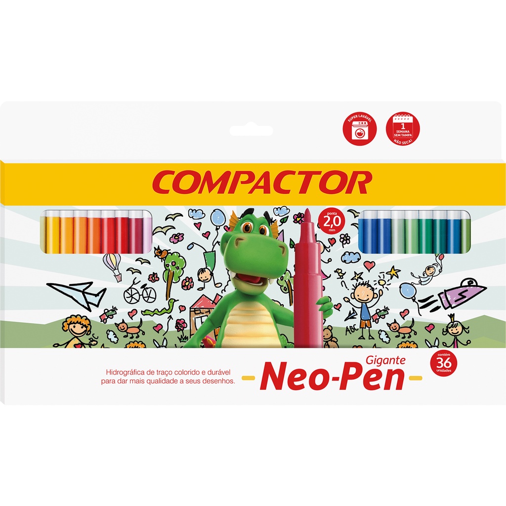 As canetinhas hidrográficas Neo-Pen da Compactor são grandes amigas da criançada. Todos os detalhes nesse produto forma pensados para garantir diversão, aprendizado e muita segurança! Neo-Pen tem ponta super resistente, mas escrita macia. Isso significa que mesmo os mais novos conseguem produzir traços bem coloridos sem danificar a ponta das canetas. Se juntarmos isso a um super compartimento de tinta, teremos um produto que dura muito mais, afinal quem não gosta de economia e eficiência? As cores das canetinhas hidrográficas Neo-Pen são muito intensas, tornando os desenhos muito mais vibrantes e cheios de vida! No quesito segurança, a Linha Neo-Pen também é imbatível! Sua tampa é anti-asfixiante e a tampinha da ponta de trás é muito bem fixada para evitar acidentes com os pequenos. Sua tinta à base de água é super lavável e dispensa uso de alvejantes para retirar as manchas do uniforme. Com 36 cores, esse é o produto perfeita para desenhar, colorir e se divertir.